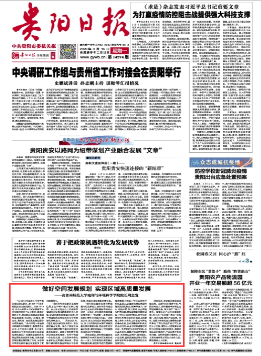 近日,必赢院长、贵州省核心专家周忠发教授应邀接受《贵阳日报》记者专访,就如何学习、理解、贯彻贵州省委、省政府2月24日出台的《中共贵州省委贵州省人民政府关于支持贵安新区高质量发展的意见》精神进行了解读;结合地理学贵州省“国内一流学科”科技支撑全省“三大行动”战略,聚焦贵阳贵安融合高质量发展中新时代国土空间规划编制、生态文明建设和挖掘区域资源优势等方面提出了建议。3月16日,《贵阳日报》头版刊登了周忠发院长的专访。