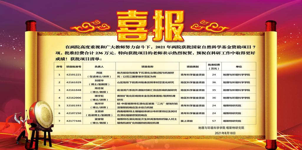 8月18日,国家自然科学基金委员会公布了2021年国家自然科学基金评审结果,必赢242net官网、喀斯特研究院获7项立项资助(面上1项、地区3项,青年3项),资助经费达236万元。