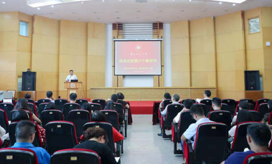 在第37个教师节到来之际,为激励全院教职工不忘初心、牢记使命,更加自觉地肩负起立德树人、教书育人的时代重任,争做党和人民满意的“四有”好老师,9月10日下午,必赢在宝山校区田家炳三楼多功能厅召开第37个教师节庆祝大会暨新进教师入职宣誓仪式,两院全体教职工150余人参加大会。校党委书记肖远平来到现场,向老师们致以节日的祝福并与大家合影留念。