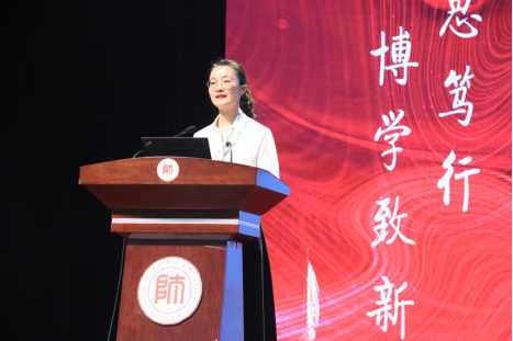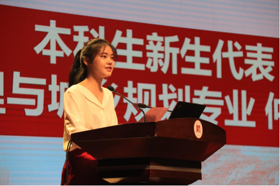 2021级本科新生代表人文地理与城乡规划专业仲高灿同学在发言中表达了对大学生活的期待、喜悦之情,她代表新生表态,他们将脚踏实地,志存高远,不忘初心,只争朝夕,做担当民族复兴大任的新时代青年,不断奋勇前行。
