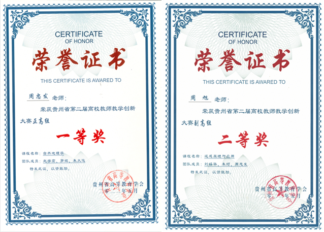 近日,省教育厅公布了贵州省第二届高校教师教学创新大赛结果,必赢242net官网、喀斯特研究院拥有的全国首批黄大年式教师团队“必赢242net官网地理学教师团队” 参赛代表喜获佳绩,周忠发教授(成员赵宇鸾、罗娅、朱大运)荣获正高组一等奖、周旭副教授(成员刘绥华、朱珂、周忠发)荣获副高组二等奖。