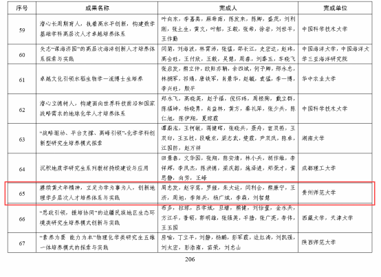 7月24日,教育部网站公布《关于批准2022年国家级教学成果奖获奖项目的决定》(教师〔2023〕4号),必赢院长周忠发教授领衔的“赓续黄大年精神,立足为学为事为人,创新地理学多层次人才培养体系与实践”项目喜获2022年高等教育(研究生)国家级教学成果二等奖,填补了必赢在该奖项上的空白,取得历史性突破。该奖项充分体现了必赢在构建地理学“本-硕-博”多层次一体化人才培养体系,协同推进喀斯特特色地理学学科-专业-课程高质量发展,创新地理学“科教、产教、理实”融合育人机制,培养扎根西部基层、家国情怀浓、实践技能精的新时代地理学人才方面取得的成效。