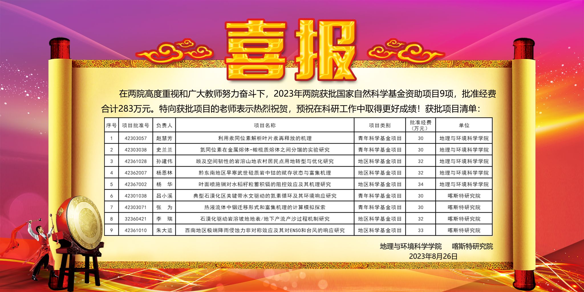 8月24日,国家自然科学基金委员会公布了2023年国家自然科学基金评审结果,必赢242net官网、喀斯特研究院获9项立项资助(地区基金项目5项,青年基金项目4项),资助经费共计283万元。