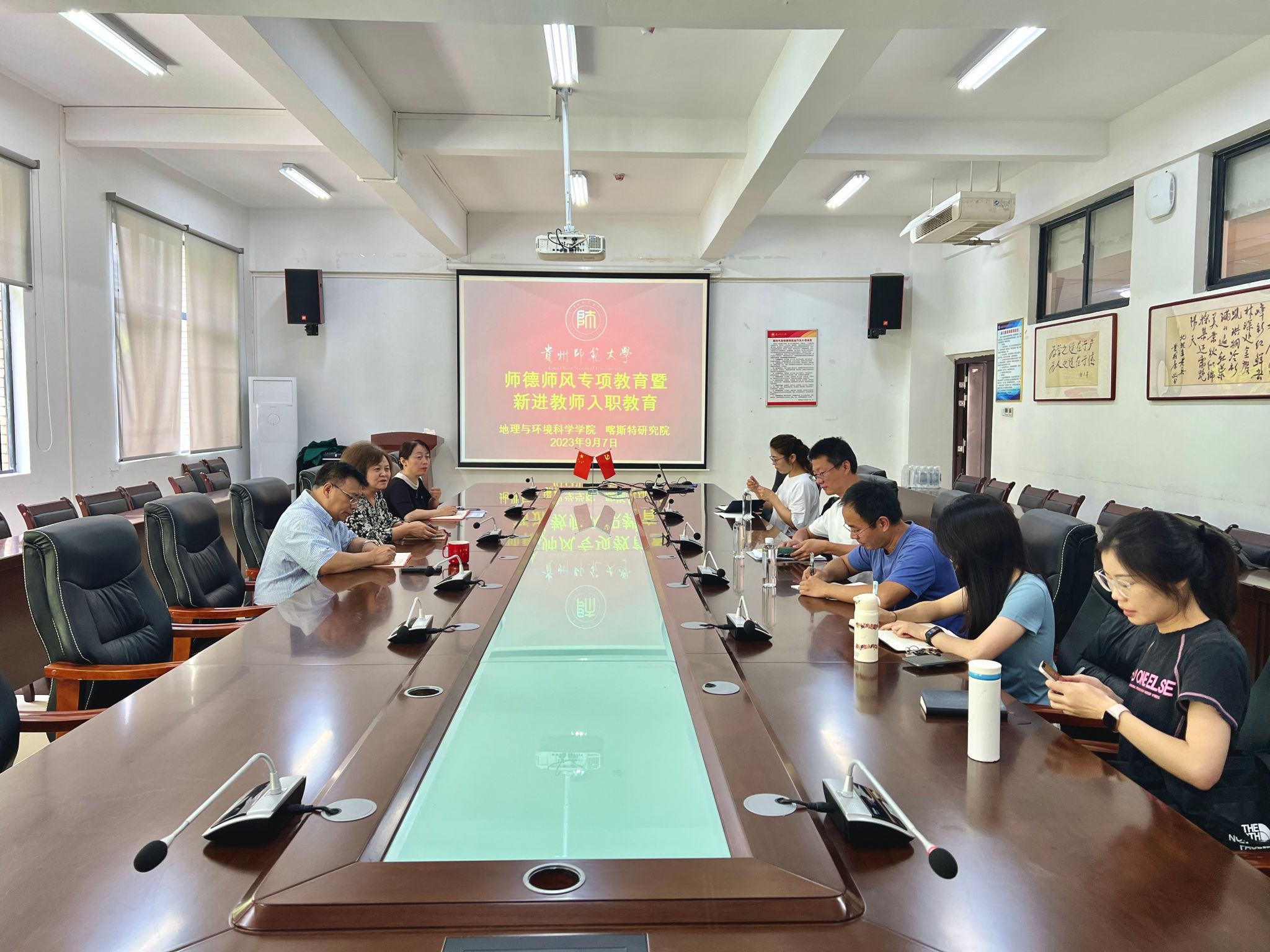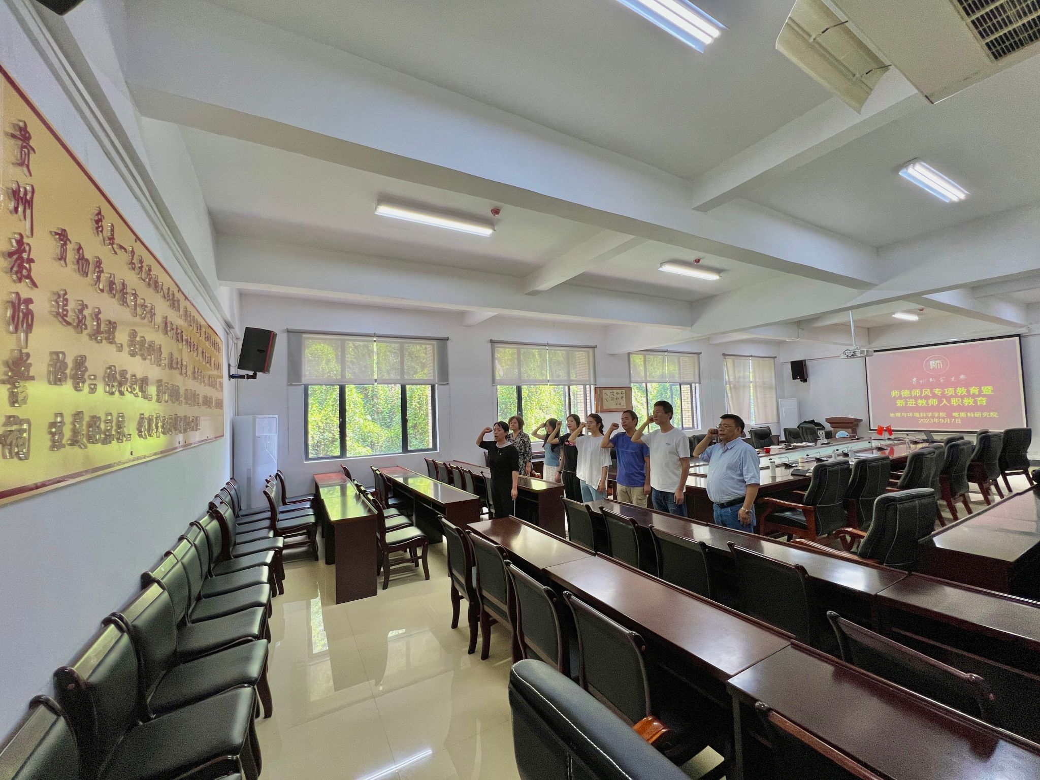 郭锐领誓,带领大家开展了贵州教师誓词宣誓活动。宣誓完毕后,周忠发对五位新进教师从教学、科研、管理等三个方面提出了要求,希望新进老师能尽快适应大学教师角色,尽快融入到单位工作中,认真履行教师职责,为学院高质量发展贡献自己应有的力量。