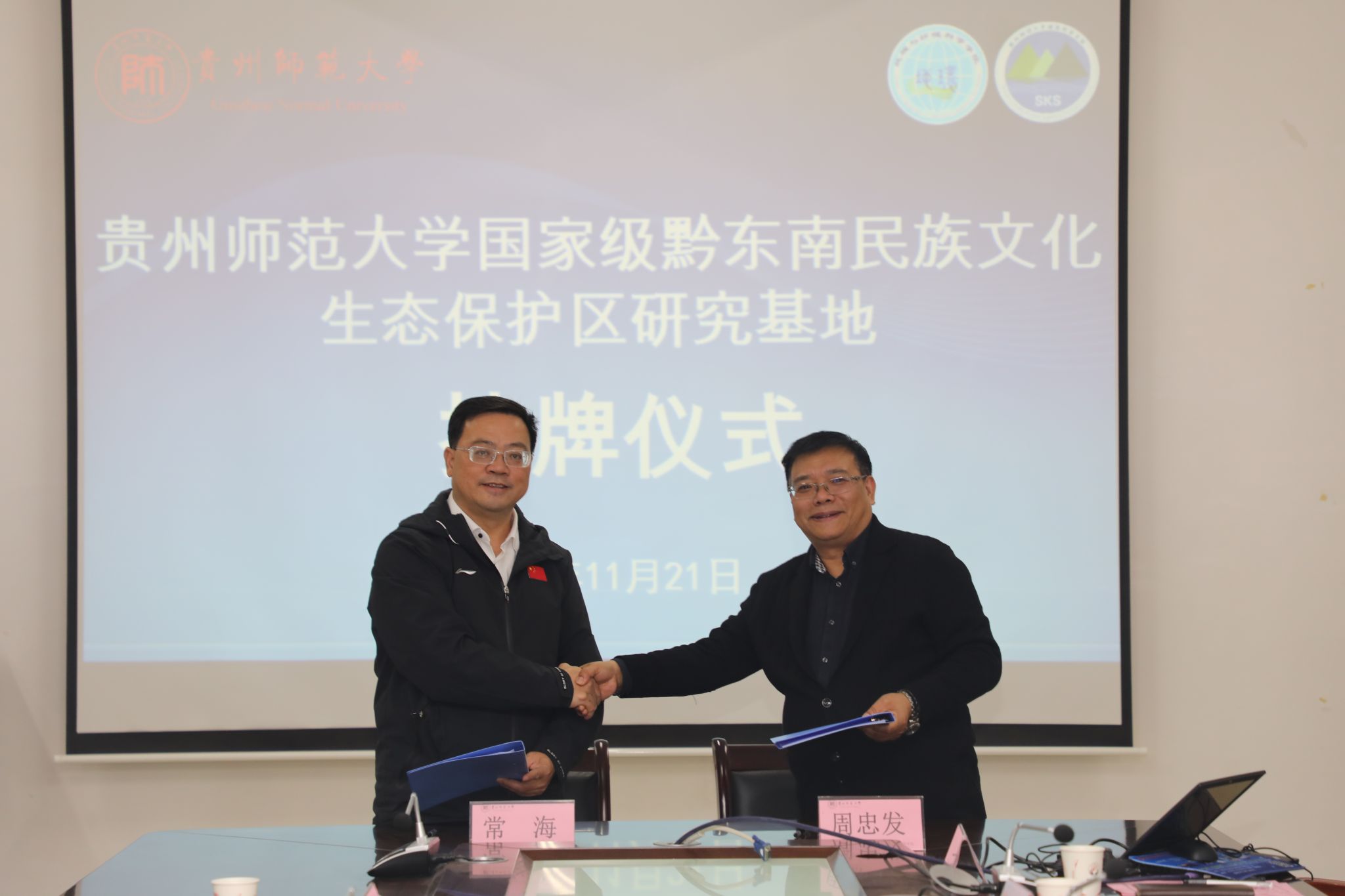 会上,常海与周忠发代表双方签署了战略合作协议,共同为“必赢242net官网国家级黔东南民族文化生态保护区研究基地”揭牌并合影留念。会前,常海一行参观了必赢242net官网博物馆。