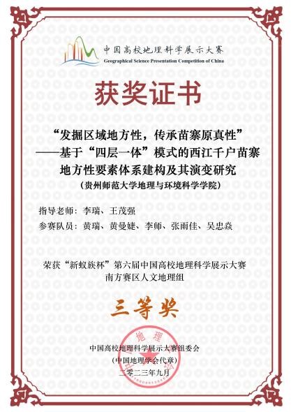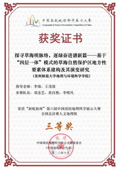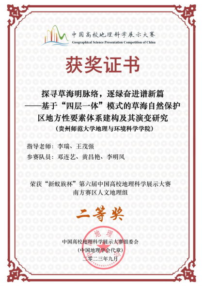 本届大赛延续了南北赛区赛和全国总决赛的两级赛制。9月22-24日,通过在南宁师范大学举办的南方赛区赛(人文地理组)的激烈角逐,贪生pass队(成员:邓连艺、黄昌艳、李明凤)凭借作品《探寻草海明脉络,逐绿奋进谱新篇——基于“四层一体”模式的草海自然保护区地方性要素体系建构及其演变研究》的优异表现于81支队伍中脱颖而出,获得了南方赛区赛二等奖(人文地理组),并获于10月27至29日在西北大学举办的全国总决赛资格,最终斩获全国总决赛三等奖(人文地理组)。另一支队伍“大地之队”(成员:黄瑞、黄曼婕、李师、张雨佳、吴忠焱)也凭借作品《发掘区域地方性,传承苗寨原真性——基于“四层一体 "模式的西江千户苗寨地方性要素体系建构及其演变研究》的优异表现,获得了南方赛区赛三等奖(人文地理组)。