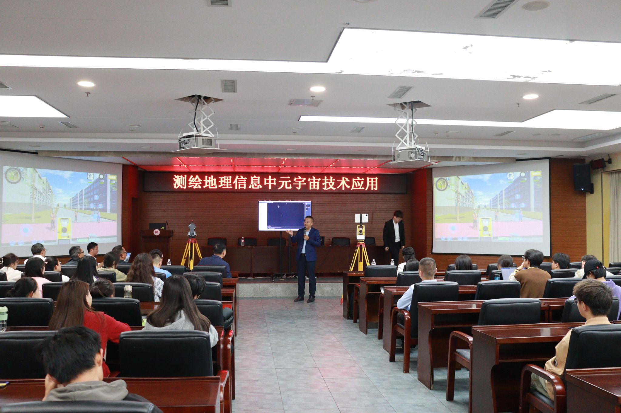 首先,杨广斌教授对郭宝宇副总经理的莅临指导表示热烈欢迎,并给师生们介绍了郭宝宇副总经理的主要学术成就和贡献。随后,郭宝宇副总经理从虚拟仿真内外业一体化、元宇宙技术在测绘地理信息行业的应用、从信息化测绘到智能化测绘的演进趋势、测绘地理信息人才培养等方面分享了测绘地理信息的前沿技术发展。