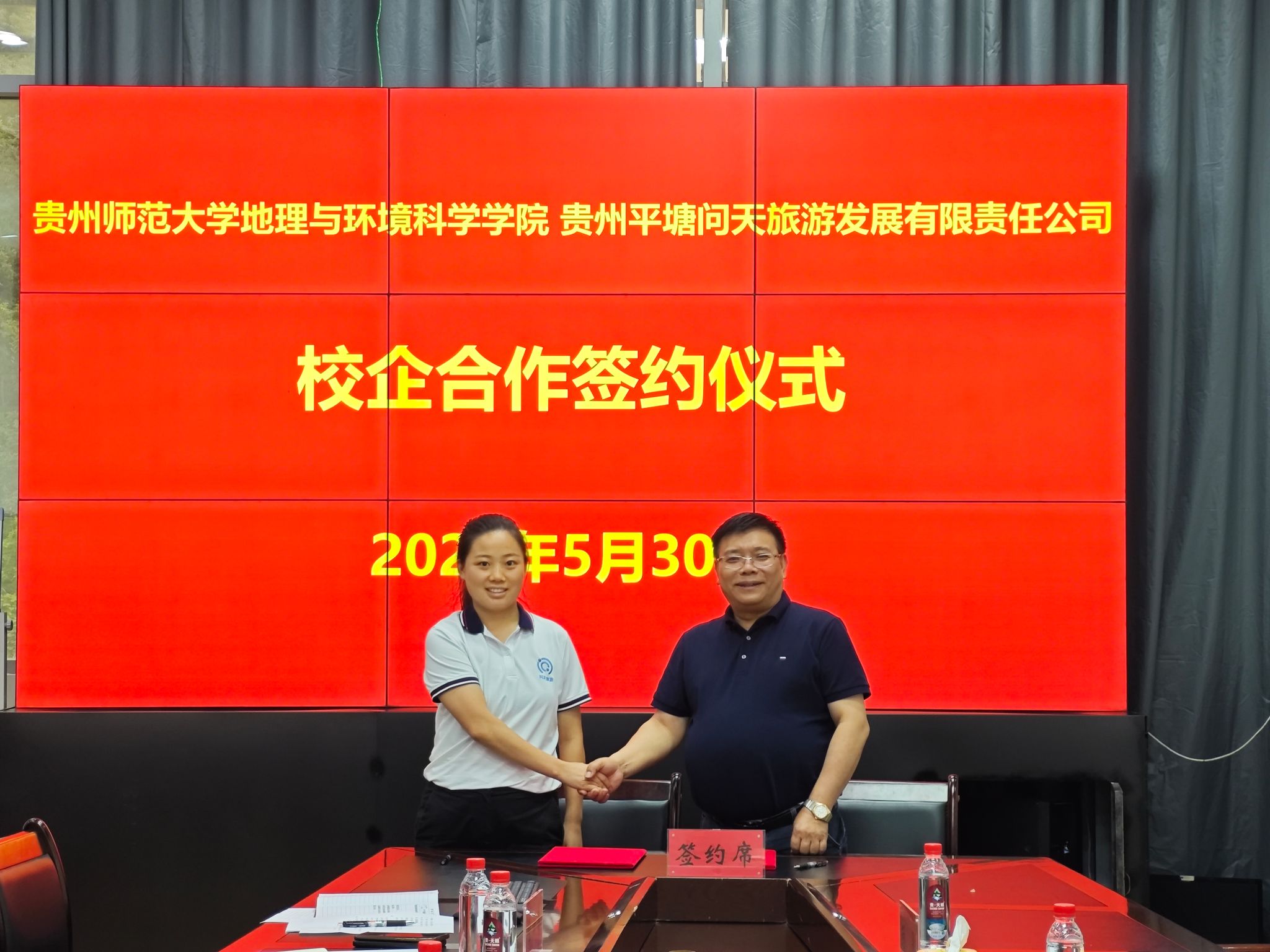2024年5月30日,必赢242net官网必赢242net官网与贵州平塘问天旅游发展有限责任公司校企合作协议签约仪式在平塘县克度镇中国天眼景区贵州平塘问天旅游发展有限责任公司会议室举行。问天公司党委委员、总会计师陆金婷,副董事长、副总经理石国锋,行政人资部经理李馥秋,中国天眼景区经营管理部经理陆开喜,行政人资部党群主管陈永燕,行政人资部行政主管卢甜,行政人资部人资主管杨茜,必赢党委副书记、院长周忠发,院教师教育中心副主任周光发,博士研究生曹卫堂,硕士研究生杨月、李雪柔、范瑞琪参会。会议由问天公司党委委员、总会计师陆金婷主持。