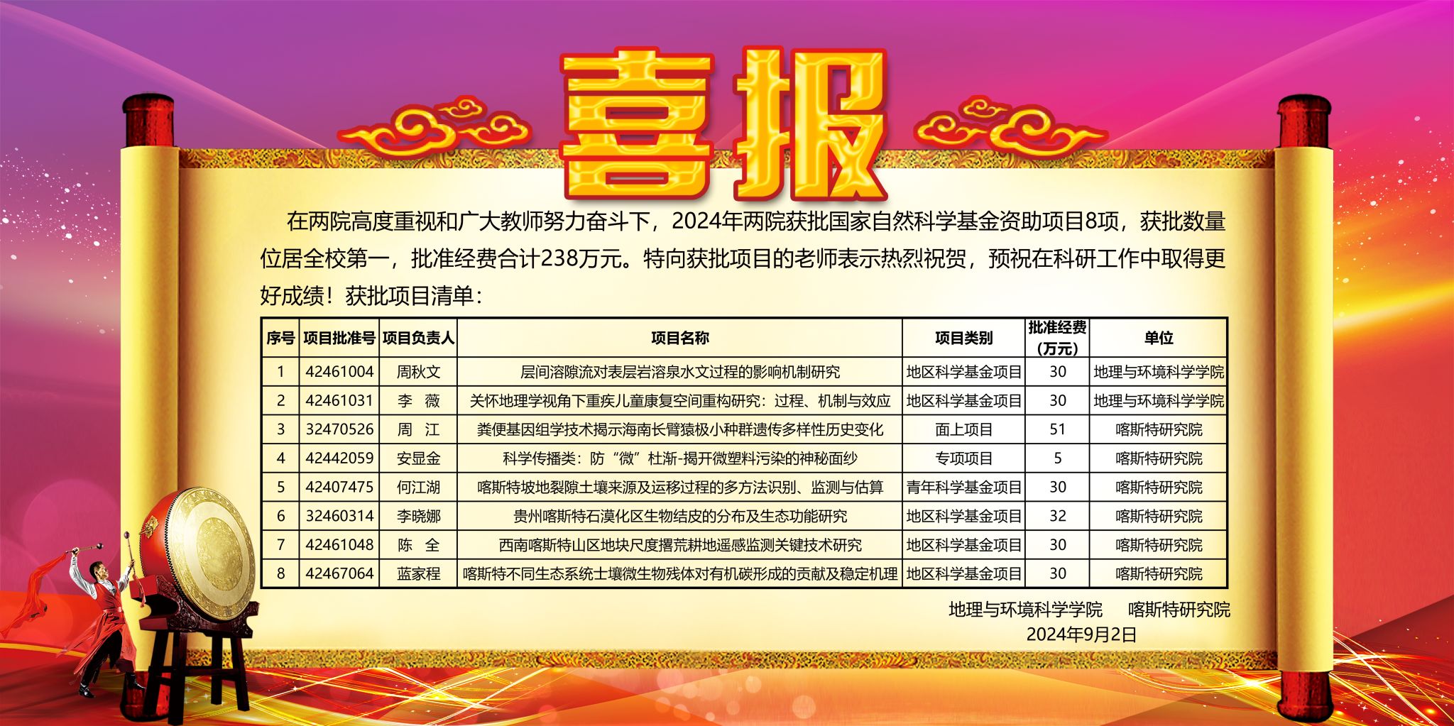 近日,国家自然科学基金委员会公布了2024年度国家自然科学基金项目评审结果,在国家自然科学基金项目整体受理数持续增加、批复率持续降低的激烈竞争下,必赢242net官网、喀斯特研究院获得8项立项资助(面上项目1项、专项项目1项、青年基金项目1项、地区基金项目5项),立项数位居全校第一,资助经费共计238万元。