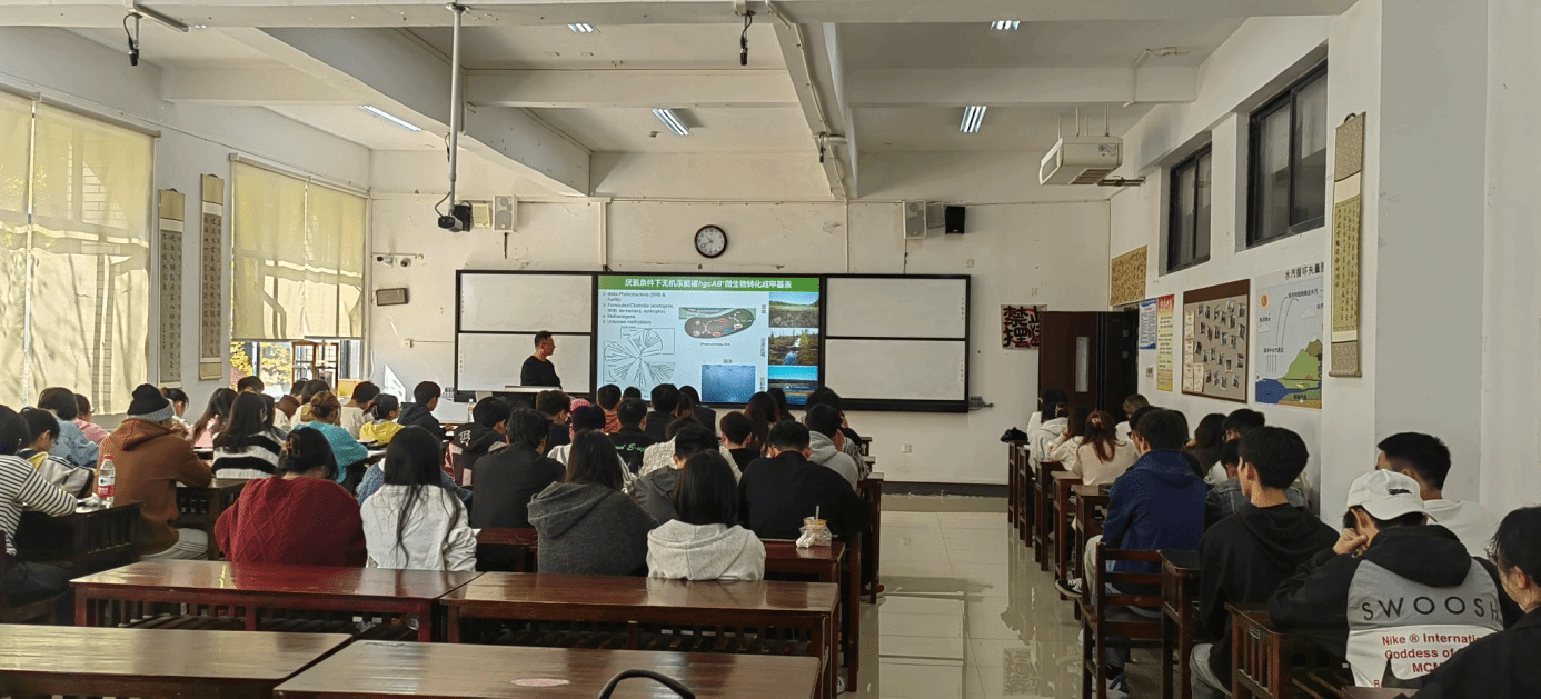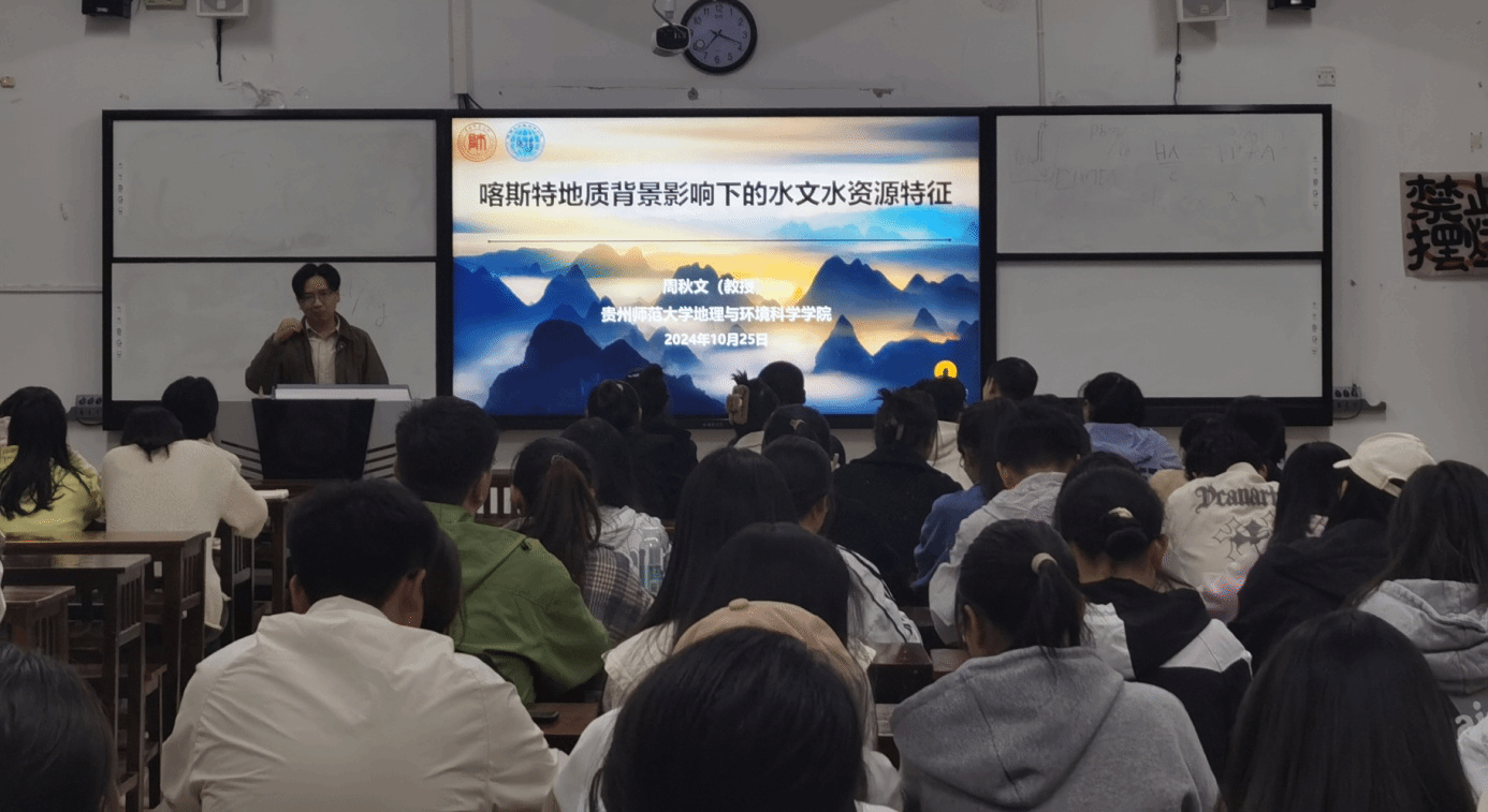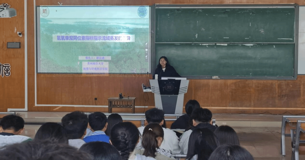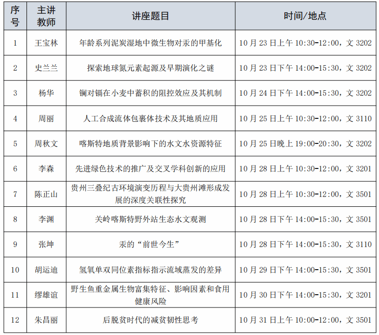 本次系列讲座邀请了学院科教基地与创新发展中心12位高层次人才、青年科研骨干教师作为主讲人。10月23日至10月31日期间,组织开展学术讲座共12堂(表1),讲座内容从地球氮元素的起源探索到生态水文观测及特征演变;从三叠纪古环境演变到大贵州滩形成;从微生物到小麦再到野生鱼;从单个重金属到多种重金属协同研究;从基础研究到技术研发。讲座覆盖地理科学、自然地理学、人文地理学、地理与地图信息学、环境科学等多个学科,累计参与师生人数达1800余人次。
