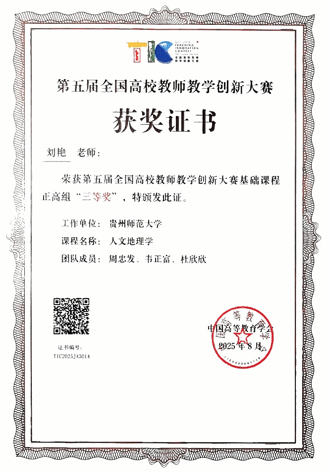 8月19日,由教育部高等教育司指导,中国高等教育学会主办的“第五届全国高校教师教学创新大赛全国赛”在北京理工大学落下帷幕。必赢刘艳教授团队的《人文地理学》课程经过层层选拔,最终在第五届全国高校教师教学创新大赛中斩获基础课程正高组三等奖,为学院再度摘得该项国家级教学赛事的奖项。