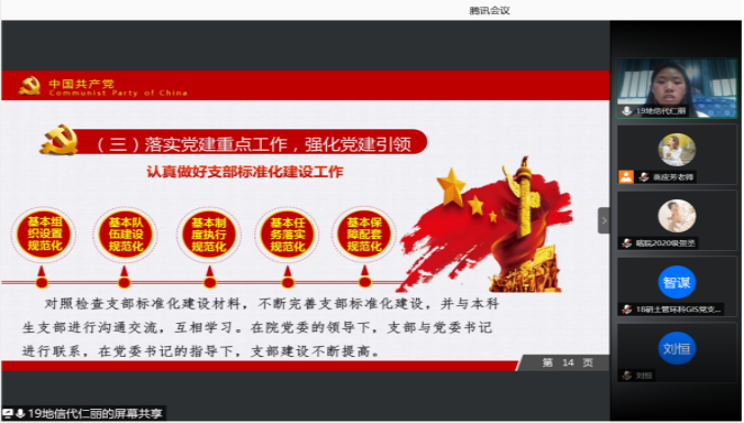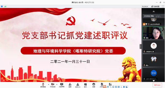 教工党支部述职会上,地环教工地理科学党支部、地环教工人文党支部、地环教工GIS党支部、地环教工环境党支部、地环教工园林党支部、喀院教工水保党支部、喀院教工地信与遗产党支部、喀院教工林草党支部、地环教工行政党支部共9个教职工党支部的支部书记,分别以PPT形式,主要围绕以下五个方面进行述职:一是加强党的政治建设,把“两个维护”体现在具体行动中;二是履行全面从严治党主体责任,强化守土有责、守土担责、守土尽责的政治担当;三是强化党建引领,推动党的组织优势更好转化为治理优势;四是加强党的作风和纪律建设,保持党同人民群众血肉联系;五是加强涉及党建工作问题的整改落实,不断提升党建工作质量。