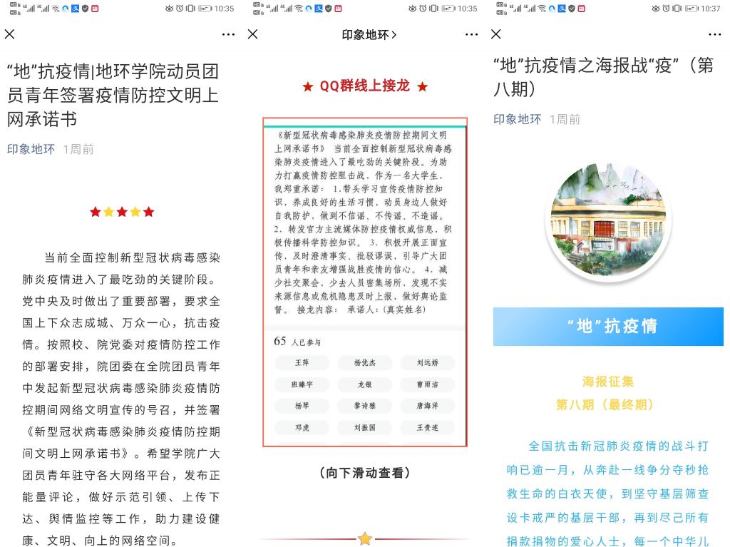 另一方面,院团委高度重视青年阵地建设,充分发挥共青团组织作用,切实加强党团共建。疫情期间,院团委多途径积极普及抗疫指南,动员团员青年签署疫情防控文明上网承诺书,协助解决青年学生疫情期间心理困惑,开展志愿者活动,组织“地”抗疫情海报设计,既作疫情期间青年学生的“贴心人”,又多措并举当好他们的“引路者”。