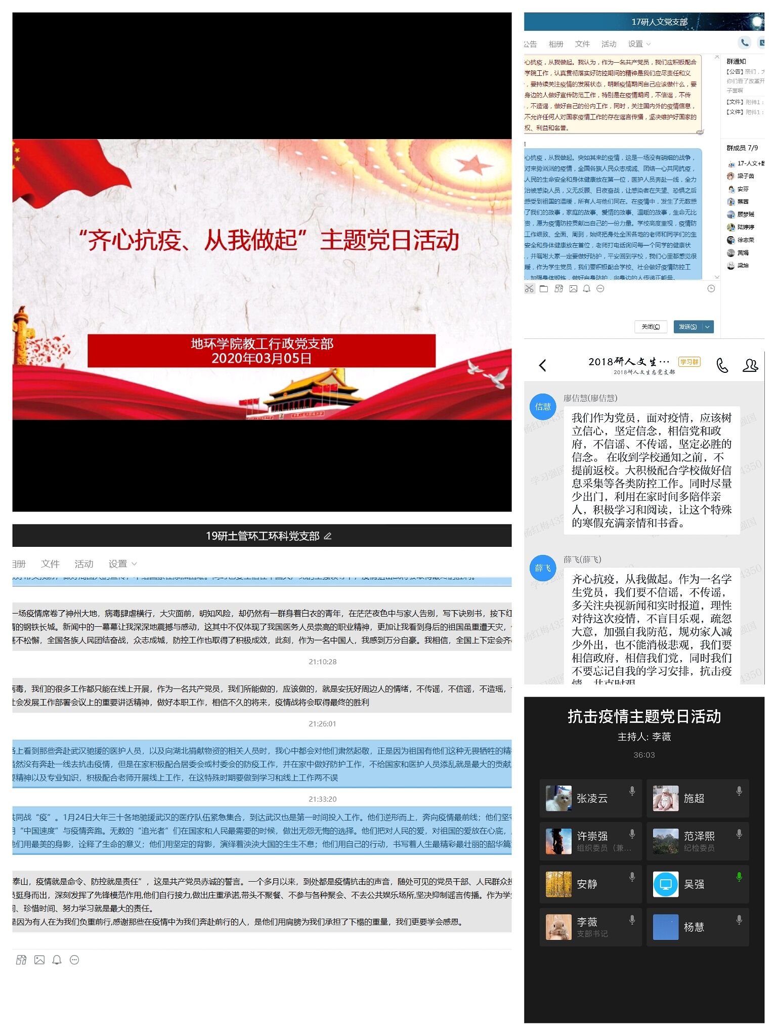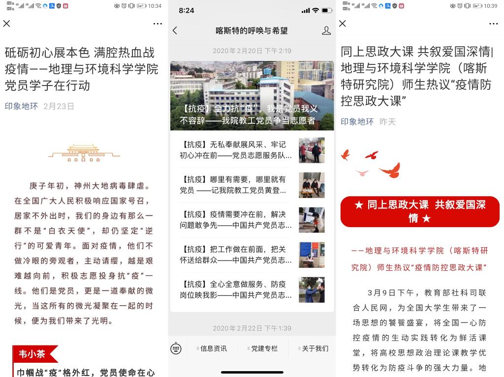 四是加强师生宣传教育和舆论引导。一方面,院党委以先进为引领,树立模范典型,凝聚榜样力量,注重在疫情防控狙击战中挖掘先进党组织典型和先进党员事迹。利用微信公众号“印象地环”、学院官方网页、学院党建工作QQ群、学院党建工作微信群等新平台,充分展现学院党员师生在面对疫情时,志愿请缨上卡点、众志成城抗疫情,不计得失,主动服务,为保障人民群众生命安全,坚定“逆行”的政治本色和精神面貌,截止目前已宣传报道先进党员信息10余条。