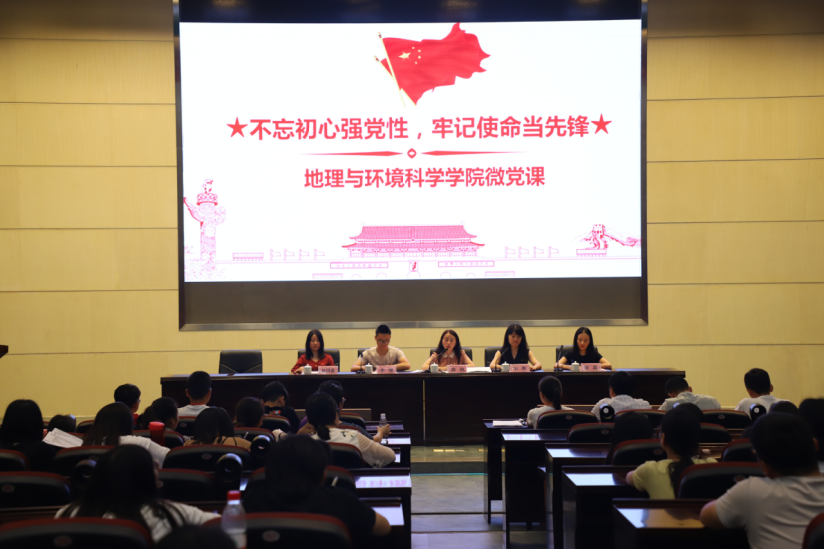 在新党员宣誓、老党员重温入党誓词环节,由朱琳领誓,郭锐监誓,全体党员举起右拳面对党旗庄严宣誓。随后,16土管班李胜鹏作为新党员代表发言;李维宣读2018年度优秀党支部和优秀党员的表彰文件;学院领导和老师分别为新党员进行党员寝室授牌。