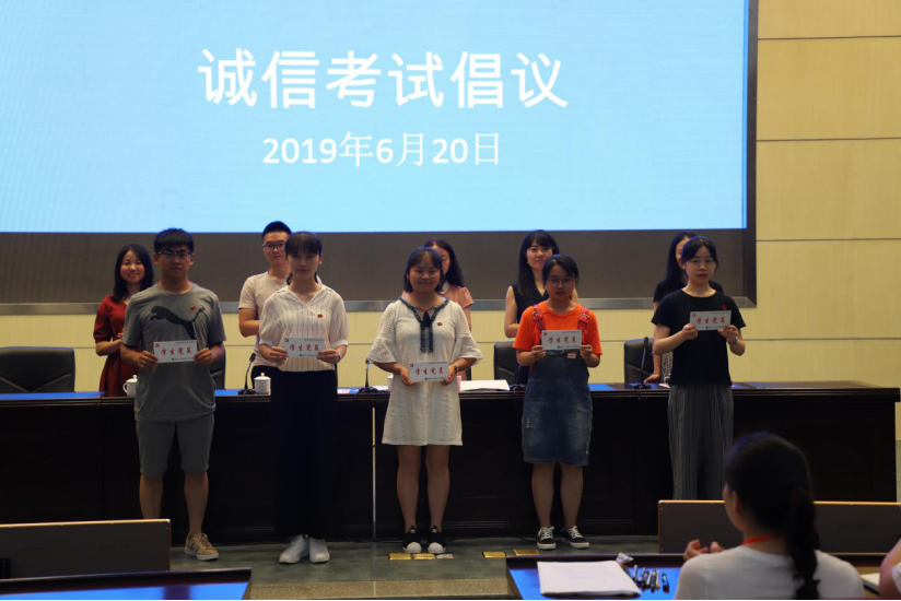 在诚信考试倡议环节,17环科班龙伊伊作为学生党员代表作了诚信考试倡议;参会领导和老师们分别为学生党员发放了诚信考试自我监督牌。