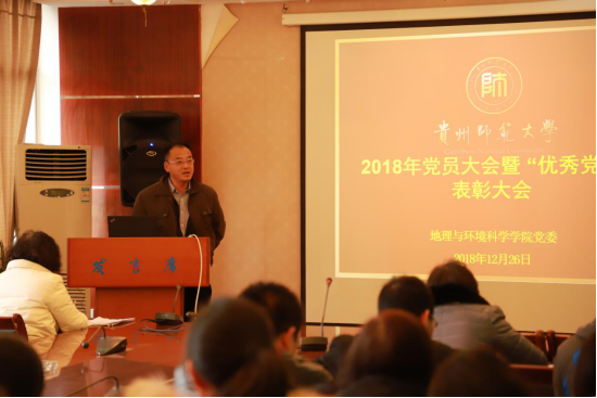会上,学院党委首先开展了教职工党支部书记抓党建工作述职。学院地理科学系、人文地理与城乡规划系、地理信息科学系、环境科学系、园林系和行政共六个教职工党支部的支部书记,分别以PPT形式,主要围绕履职情况、存在问题和改进措施三个方面,就2018年抓党建工作情况进行了10分钟的述职。接着,大会表彰了2018年度教职工“优秀共产党员”。郭锐通报了学院2018年党建创新项目获批情况。