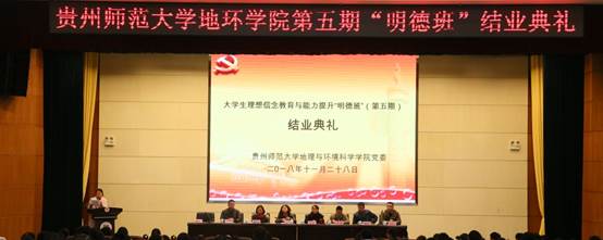 2018年11月28日晚上19:00,必赢242net官网党委第五期“明德班”结业典礼在学校国际会议中心一楼学术报告厅举行。院党委书记杨建红、副书记郭锐,专职辅导员翁应芳、李维,兼职辅导员钟玲敏、孙建伟、喻阳华以及学生党建中心成员和第五期“明德班”全体学员参加。典礼由刘婷婷主持。