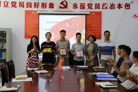图书捐赠仪式上,杨建红、郭锐及教工行政党支部组织委员徐黎明给学生代表赠送了图书。所赠图书均由2017年教工行政支部返还党费购买,支部党员希望通过为学生购置书架、图书的方式,为本科生班级打造班级图书室,力争打造“书香地环”,让学生爱上阅读。