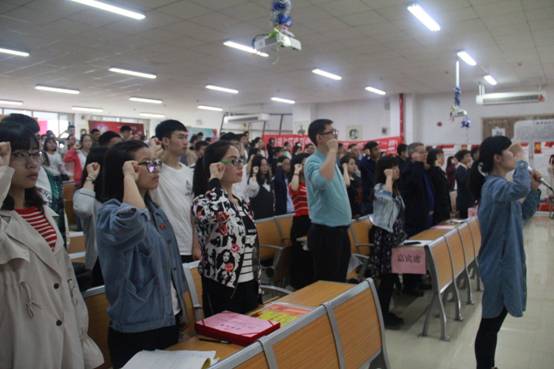 随后全体党员面对党旗,新党员进行入党宣誓,老党员重温入党誓词。