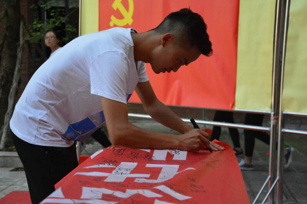 活动内容分七项进行。新党员入党宣誓暨老党员重温入党誓词:由杨建红监誓、田伟领誓,全体党员列队树立,面对党旗,举右手齐肩握拳,庄严宣誓。学生党员代表诗朗诵:诗歌《颂歌献给党》,回顾了我们党九十五年的峥嵘岁月,展现了一代又一代中国共产党人始终站在时代潮头,用坚定的理想信念捍卫鲜艳的红旗的历史画面,告诫党员缅怀历史,牢记使命,回眸昨天,感恩今天,展望明天。支部共建签约仪式:教工园林党支部与2013本科联合党支部,教工行政党支部与2014本科联合党支部,分别签署了支部共建协议,进一步深化学院“两学一做”学习教育,充分发挥双方党支部自身优势,不断推进服务型基层党组织建设。有党员寝室、党员自我监督卡授牌:杨建红和田伟向新党员代表发放了“有党员寝室”标牌和党员自我监督卡,鼓励党员“亮身份、亮职责、亮承诺”,争当师生满意的先锋。学生党员诚信考试做表率倡议:学生党员牟叶果代表全体学生党员作出模范遵守考场纪律的承诺,倡议全体学生党员佩戴党员自我监督卡进入考场,自觉接受监考老师和同学的监督,做诚信考试的表率,通过自己的良好表现带动周围同学,在全体学生中形成一种“遵守考纪光荣,违纪作弊可耻”的氛围,争做诚信考试模范。杨建红总结讲话:回顾了我们党的光辉历程,总结了学院党委近年来取得的成绩和荣誉;要求全体学生党员“要强化党员意识,维护党的形象”,“要自觉践行社会主义核心价值观,弘扬时代精神”,“要坚持学党规党章,学系列讲话,争做合格党员”;按照“四讲四有”党员标准,鼓励党员同学在自己平凡的岗位上做不不平凡的成绩,展示地环学生党员的良好风貌,为党旗增添光彩,为群众作出表率,为学院的发展做出自己应有的贡献。党员义务打扫学院实验楼:每个学生支部按照前期分工,纷纷赴学院实验楼打扫卫生,以实际行动积极投身“志愿服务”,向党的生日献礼。