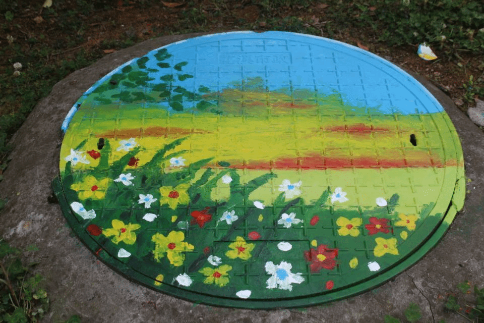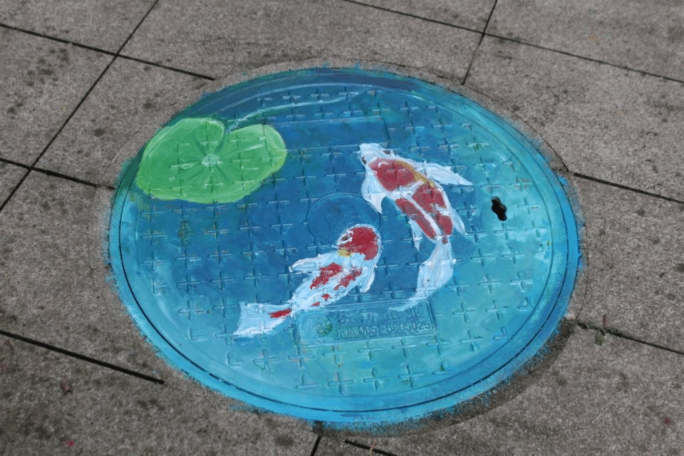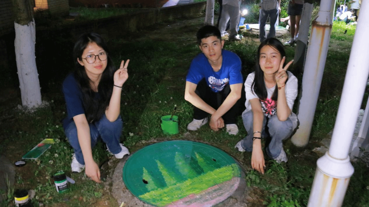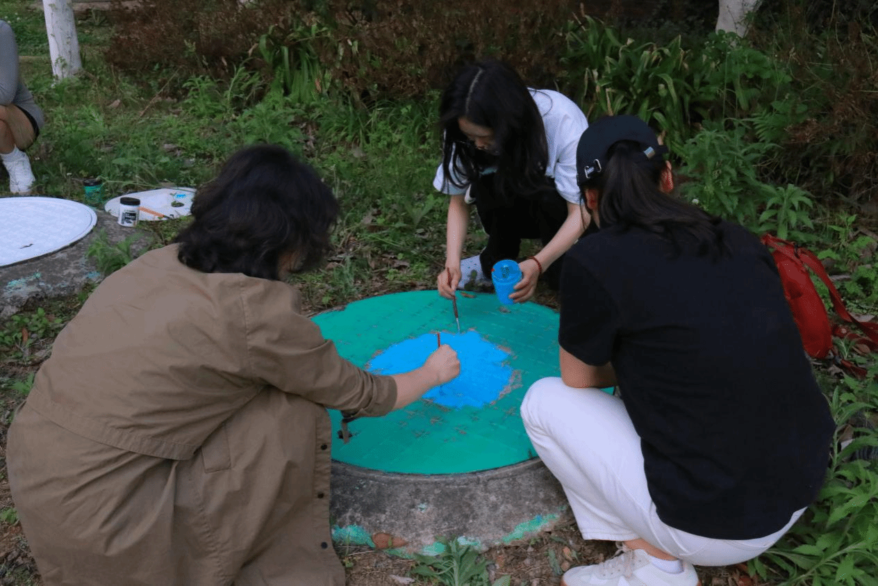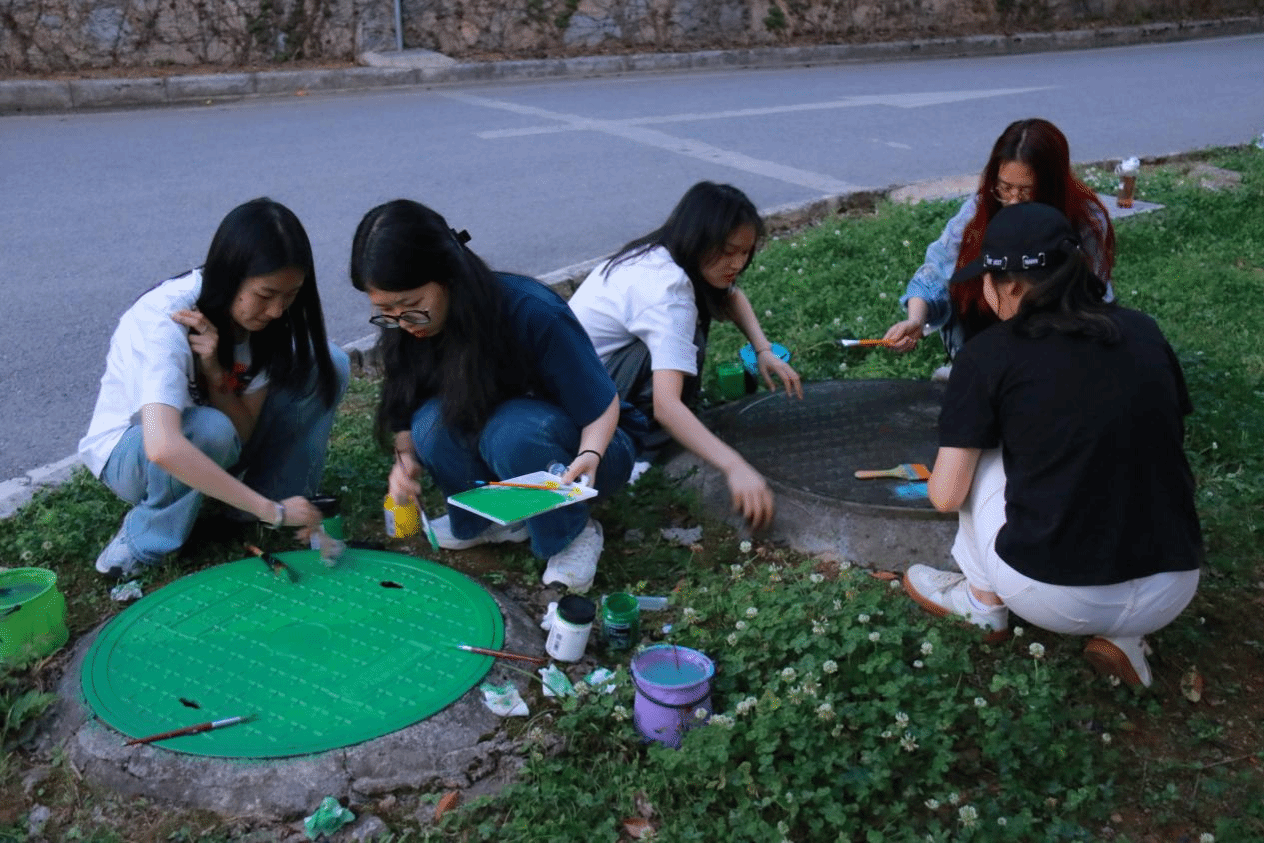 同学们依托学院与专业特色,手执画笔,一笔一画尽情挥洒描绘,将心中的“奇思妙想”呈现眼前,井盖变“景”盖,原本单调暗沉的井盖华丽变身为五彩斑斓的画作。一幅幅美丽的画作展现了春天的盎然与生机,也悄悄蕴含着夏天的浓郁与热情。阳光透过叶隙洒落在井盖上,在“青山绿水”中,倒影着迷人的光芒,形成学院一道靓丽的风景线。