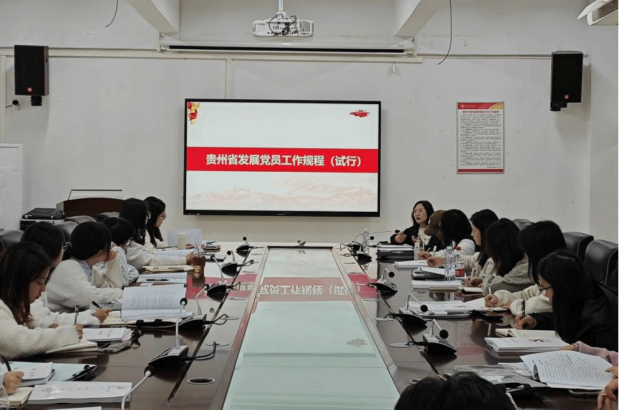院党委组织员翁应芳对照《贵州省发展党员工作规程(试行)》,对学生党员发展流程进行了详细讲解,指出入党四个阶段所产生的档案材料及其填写注意事项等。随后对发展党员各阶段的材料清单和易错事项进行了归纳总结并详细说明、解释。最后对支部“三会一课”日常工作进行了提醒和安排。