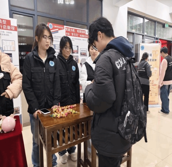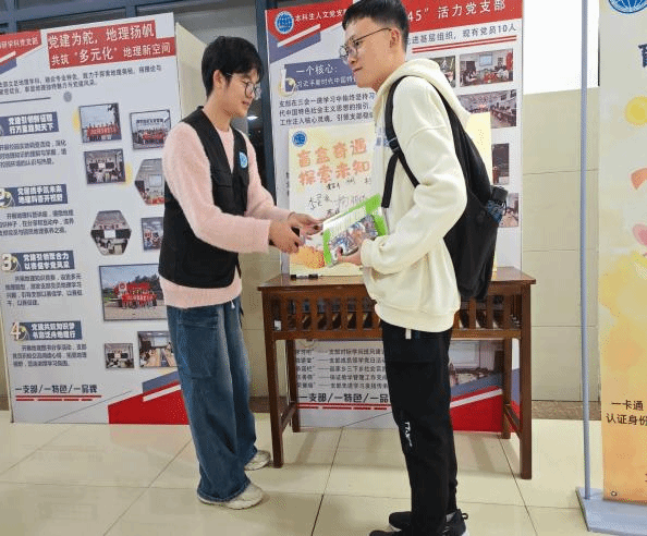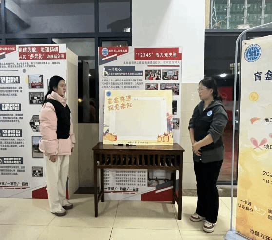 本次活动设置了地理知识问答与盲盒抽奖环节,盲盒奖品来源于全院高年级学生的爱心捐赠,共设置盲盒奖品81份,参与奖品50份,该环节吸引了众多同学踊跃参与。活动中,同学们首先按照流程向志愿者展示一卡通验证身份,以此获得答题资格。随后,志愿者向参与者提出事先准备的地理知识问题,参与者回答正确即可获得抽签机会并能抽取盲盒奖品,反之则直接可以领取参与奖品。组织本次活动的11名志愿者耐心提问,参与者积极回答,一问一答、互动自如,现场充满了竞答的互动声与抽到奖品的欢呼声,热烈非凡。同学们抽取礼物结束后在志愿者的引领下到达签名处签下自己的名字,记录这次美好的回忆。
