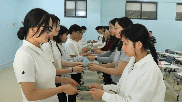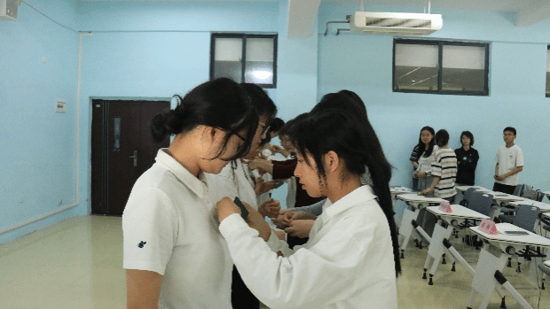 由朱老师、彭嘉、熊娅淑及23级、24级各团支部书记为新团员颁发团徽和团员证。团徽是共青团的象征,团员证是团员身份的证明,一枚枚闪亮的团徽佩戴在胸前,一本本崭新的团员证握在手中,象征着共青团使命的接力与传承。