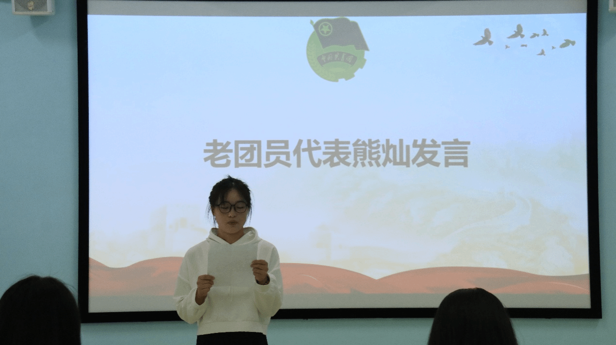 24地理科学一班团支部兼团委办公室工作人员的熊灿作为老团员代表发言。她首先向各位新团员同志表示热烈的祝贺,随后她表示作为团员,要始终铭记入团初心,珍惜青春年华,争做当代青年的先锋榜样,在奋斗中续写新时代的青春篇章!