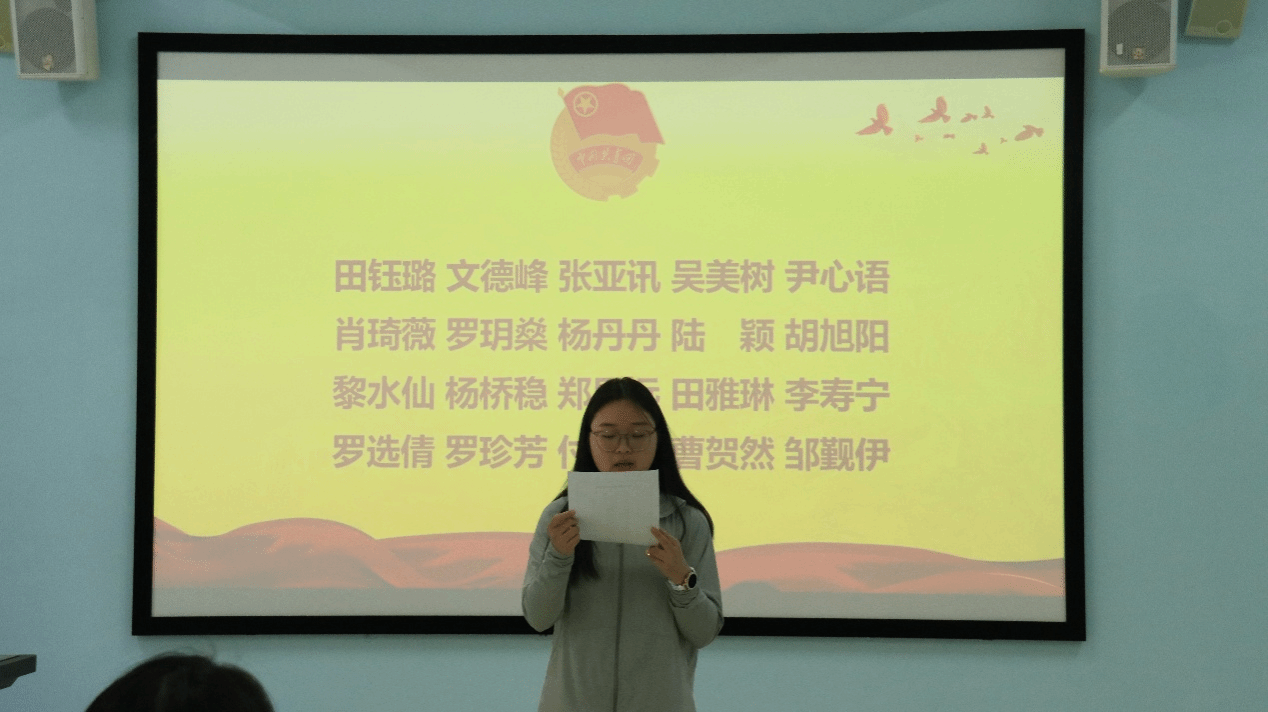 院团委副书记彭嘉宣读新团员名单,全场以热烈的掌声欢迎新团员加入中国共产主义青年团。新团员名单: