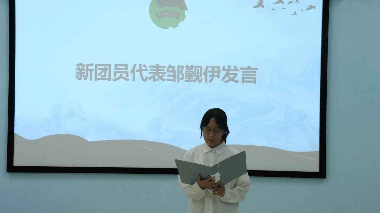 24级地理信息科学团支部的邹觐伊作为新团员代表发言。她表示加入共青团不仅是荣誉,更是责任。作为党的后备军,要以青春之力践行“请党放心,强国有我”的誓言,要接过民族复兴的接力棒,在实现中国梦的征程中书写青春华章。