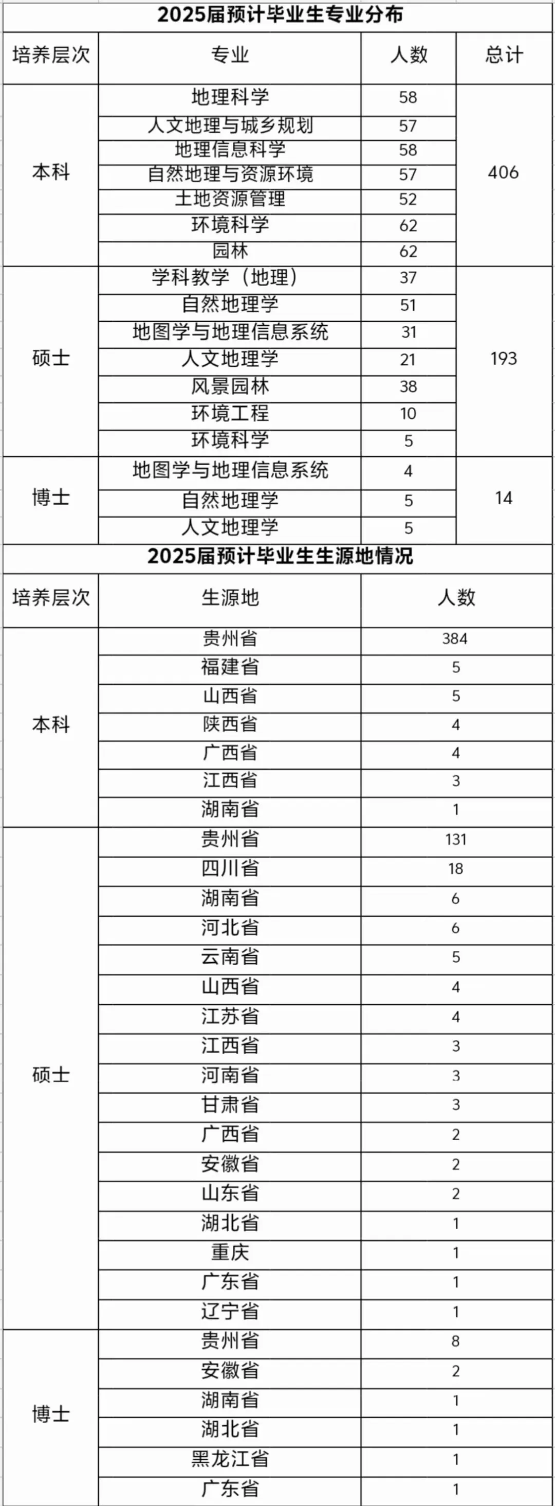地理科学专业为师范类专业,先后获批省级高校示范性本科专业、全国高校本科特色专业建设点、教育部“卓越中学教师培养项目”和“双万计划”国家级一流本科专业建设点,已顺利通过教育部师范类专业二级认证。旨在立足贵州、辐射西部,根据新时代国家基础教育改革需求,致力于培养具有健全的人格、优良的政治素质和道德品质、良好的科学素养和人文精神、正确的人地协调观,具备扎实的地理学科基础知识和教师教育专业知识、熟练的地理实践力和教育教学技能、良好的区域认知和综合思维,具有强烈的创新意识、终身发展意识和初步的地理教育教学研究能力,能胜任中学地理教育、教学、研究、管理和具备卓越教师潜质的中学地理骨干教师。