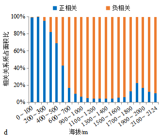 图5 广西1982—2016年NDVI与气候的相关关系:(a)年均NDVI与年均温在不同地貌单元的相关关系;(b)年均NDVI与年均温在不同海拔条件下的相关关系;(c)年均NDVI与年降雨量在不同地貌单元的相关关系;(d)年均NDVI与年降雨量在不同海拔条件下的相关关系