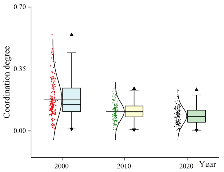图3 2000-2020年长江经济带国土空间功能协调度统计值的分布情况