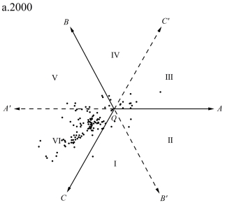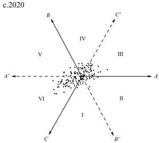 图5 2000-2020年长江经济带国土空间功能协调度类型区的极坐标结果和空间分布格局