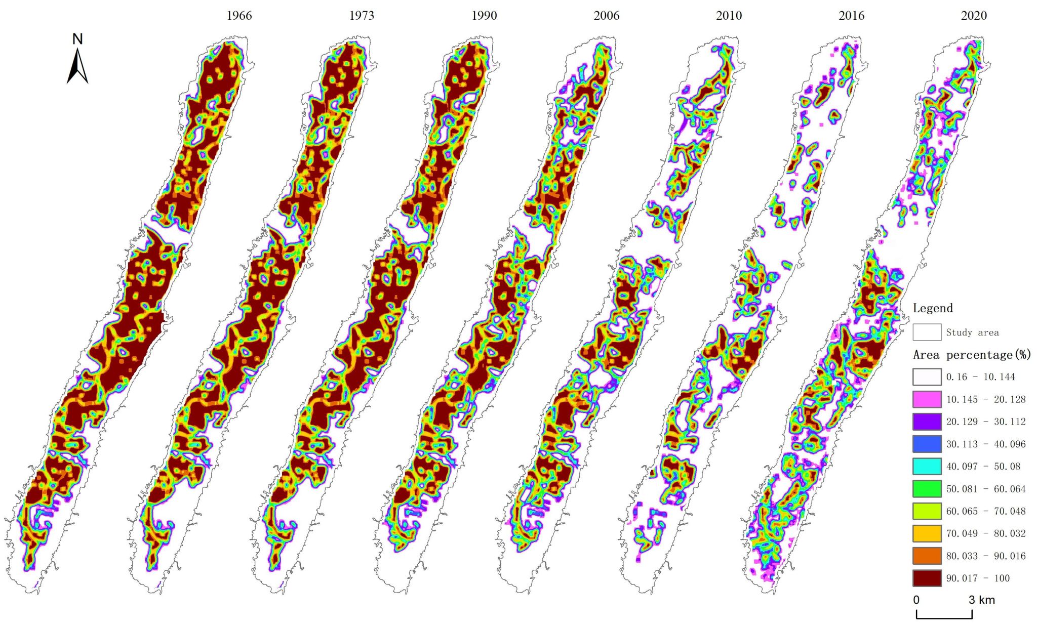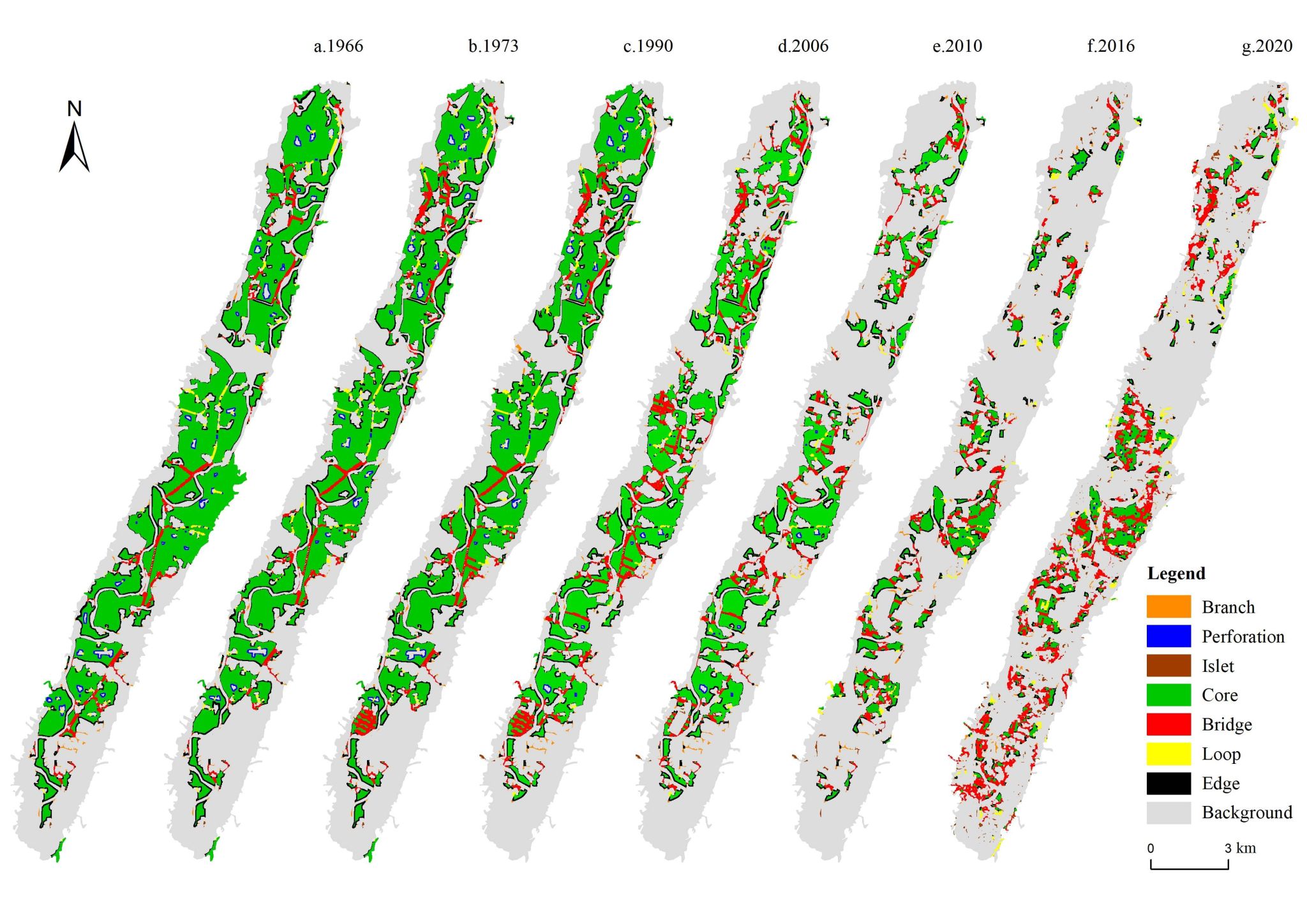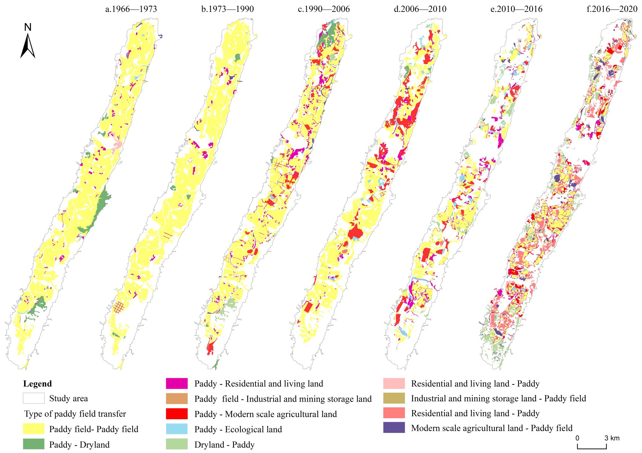 图6 1966-2020年山间坝子水田形态学空间格局
