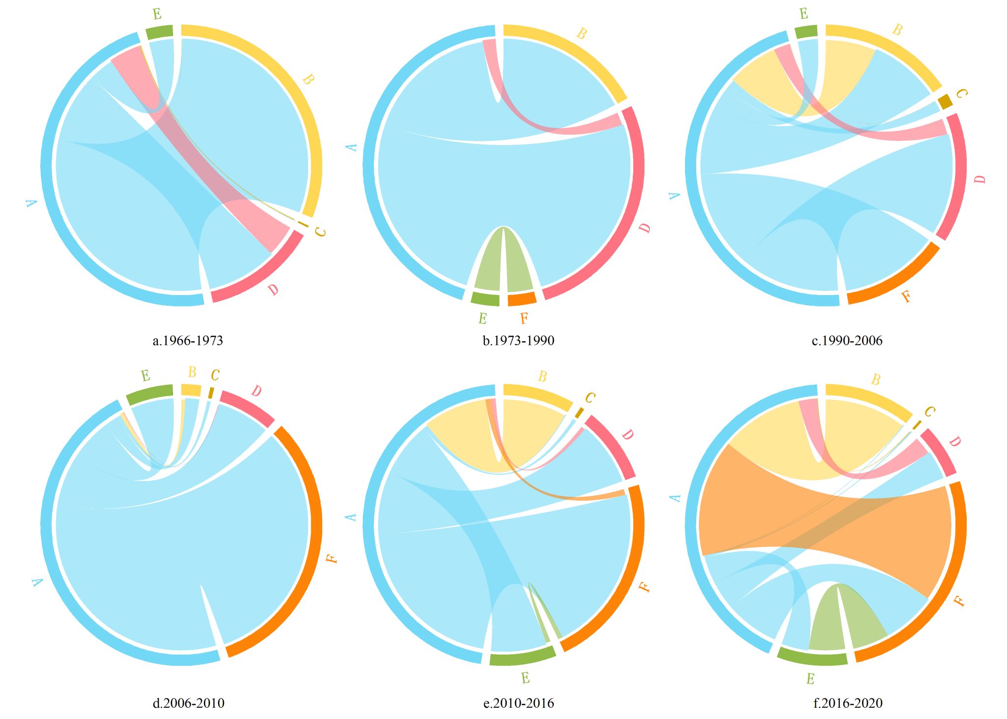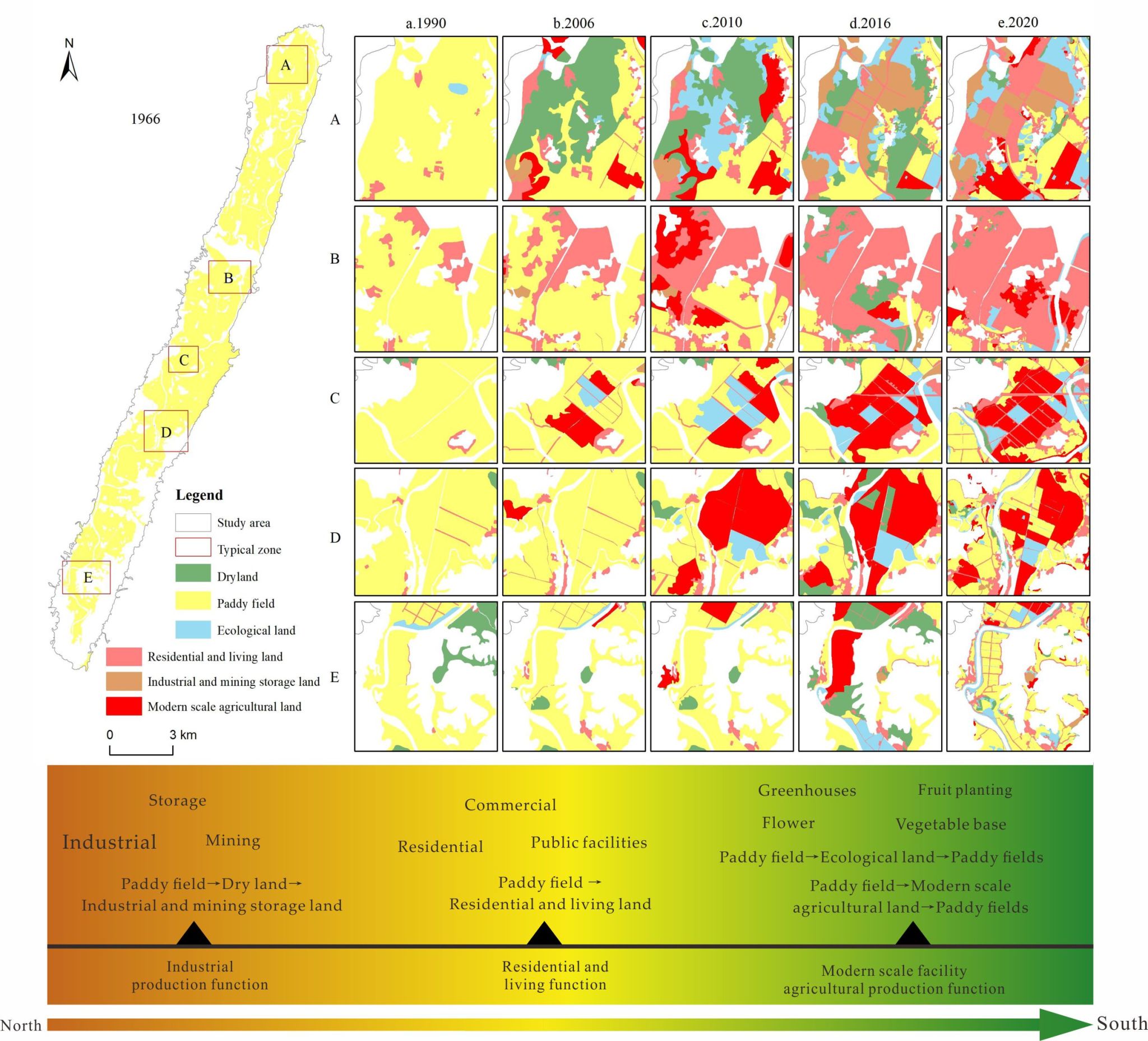 Note: A- paddy field, B-dry land, C- industrial and mining storage land, D-residential and living land, E-ecological land, F-modern scale agricultural land