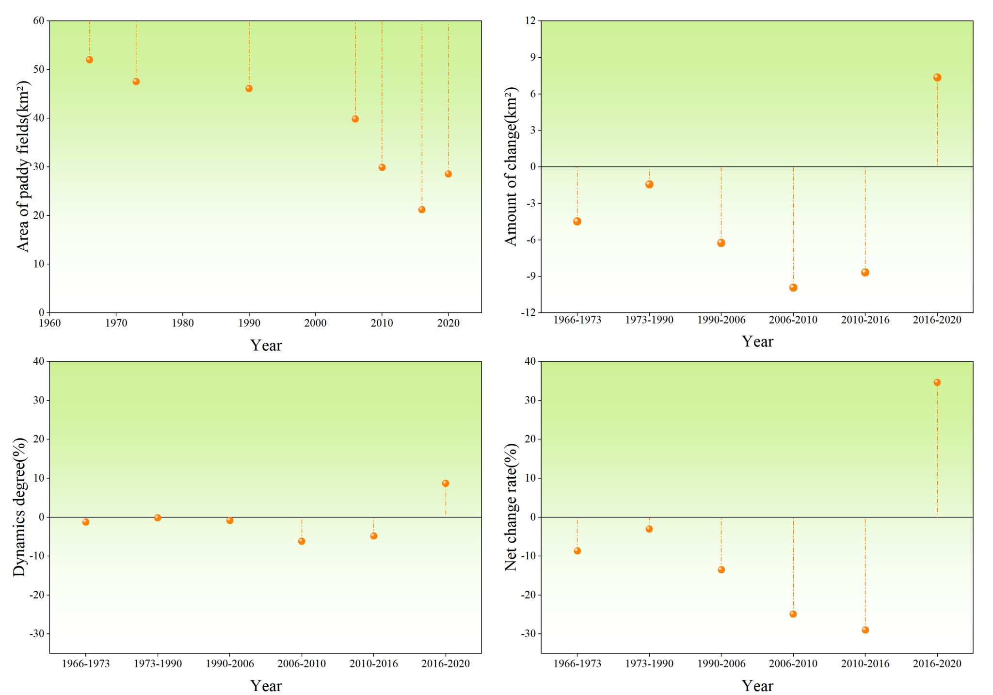 图4 1966-2020年山间坝子水田面积及其变化情况