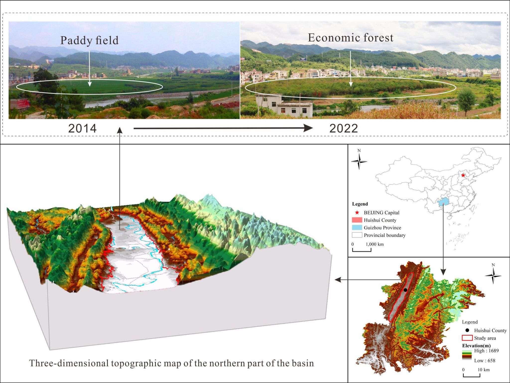 本文以中国西南岩溶山区相对于坡地的另一种地貌单元,贵州惠水大坝为研究对象。惠水大坝是贵州省分布连片最大的山间坝子,属于喀斯特盆地地貌,具有城郊的典型特征。坝内土地利用类型以水田为主,是贵州省现代农业发展的典型山间坝子,深入探讨其水田利用演变与转型特征规律,可以为全面揭示中国西南岩溶山区土地利用转型规律和人地关系演变提供基础。本文研究目标有以下3点:(1)构建岩溶山区山间坝子水田利用演变与转型研究框架;(2)以典型山间坝子水田利用为例,分析其长时间序列动态演变过程及转型特征;(3)揭示山间坝子水田利用与坡地土地利用转型的差异性规律。