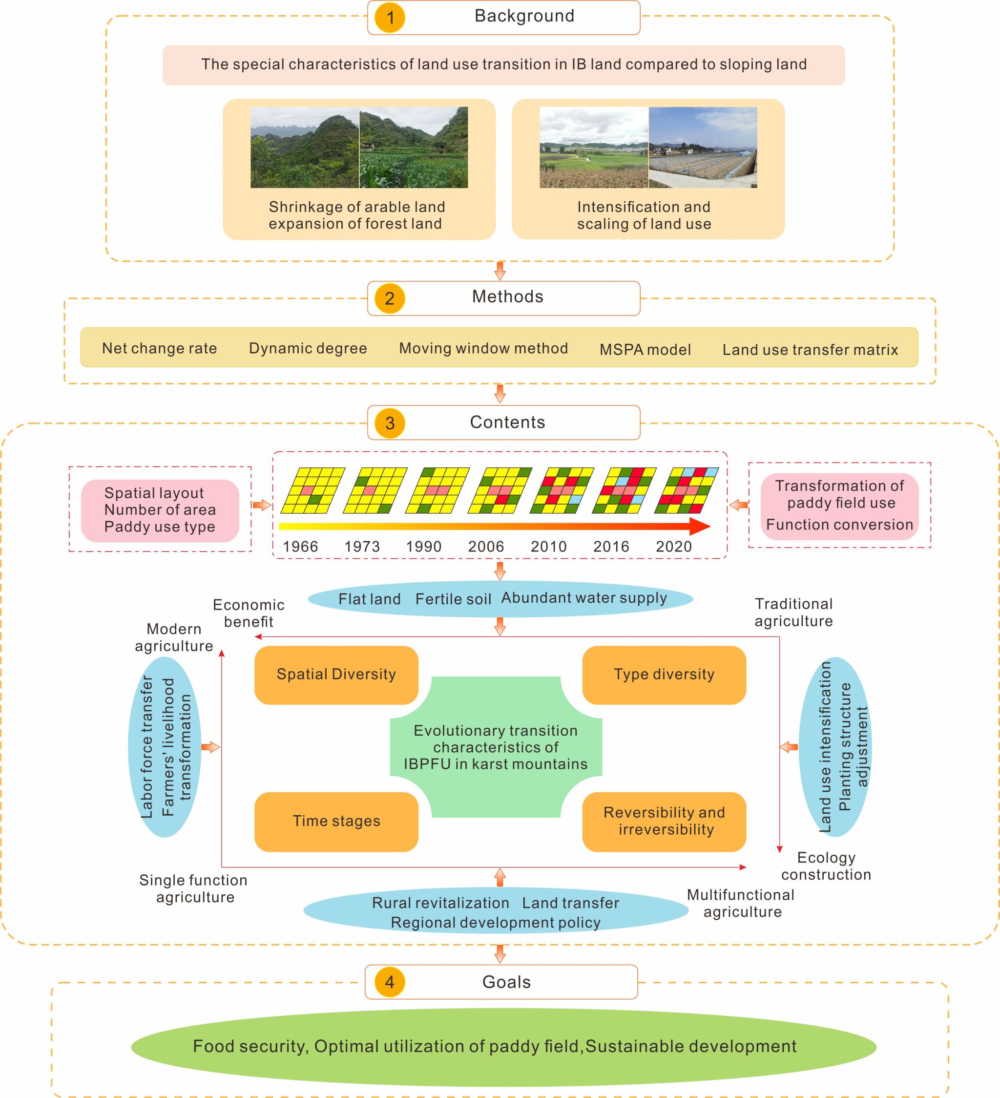 成果简介:中国西南岩溶山区山多平地少,山间坝子是其典型的地貌类型之一,当前,对岩溶山区典型地貌核心土地利用的对比研究较为缺乏。研究山间坝子水田利用演变和转型规律,对山区优化土地资源具有重要意义。本研究基于结构和功能视角,构建了岩溶山区山间坝子水田利用演变与转型研究框架,运用土地利用变化测度方法、移动窗口法和MSPA模型,分析了贵州省1966—2020年典型山间坝子水田利用演变与转型规律。研究表明:山间坝子水田利用演变具有可逆和不可逆性、多样性和阶段性的特征。山间坝子水田利用转型需要在区域社会经济发展、生态保护和粮食安全三者之间权衡。山间坝子和坡地土地利用转型共同性体现在其土地利用功能的多样化。本文通过核心土地利用类型的长时间序列演变,深入揭示了山间坝子不同于坡地的土地利用转型,为全面理解中国西南岩溶山区土地利用转型和可持续发展提供了参考。本文构建的研究框架和研究方法也同样适用于其它地区。