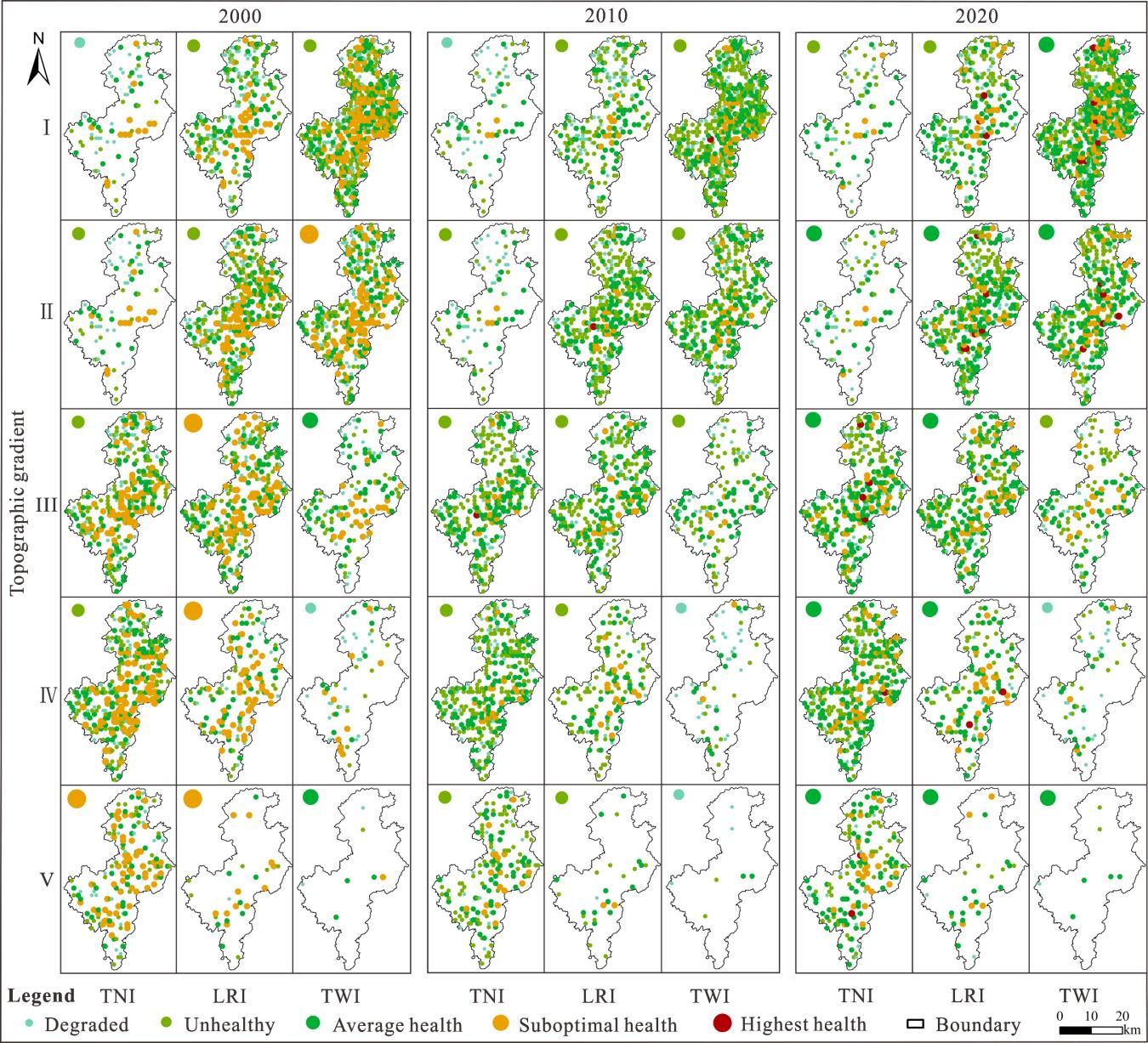 背景:生态系统健康是指自然生态系统自我组织、自我维持和恢复的能力,是人类生存和发展的基础。随着人类活动的加剧,生态系统健康受到了严重的威胁,需要加强监测和评估。景观格局是影响生态系统健康的最基本和最重要的因素之一,它通过改变生态系统的自然状态和组织结构,影响其生态功能和服务。因此,研究景观格局变化与生态系统健康之间的关系,对于恢复受损和退化的生态系统具有重要意义。山地生态系统为全球一半以上的人口提供了商品和服务,并在保障粮食安全、维持生物多样性和乡村景观等方面发挥了重要作用。山地景观格局受地形因素的影响,具有明显的空间规律性和多样性,同时也对生态系统健康产生了不同的影响。因此,从多维空间角度分析山地景观格局变化对生态系统健康的影响,对于实现山地人地系统的协调发展具有重要意义。
