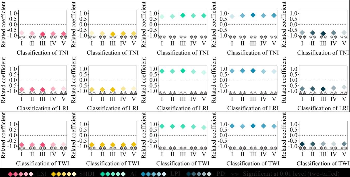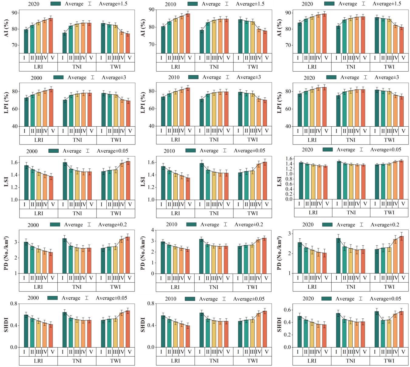 Year | Forestland (km2) | Grassland (km2) | Wetland (km2) | Farmland (km2) | Construction land (km2) | SHDI | AI (%) | PD (No./km2) | LPI (%) | LSI |