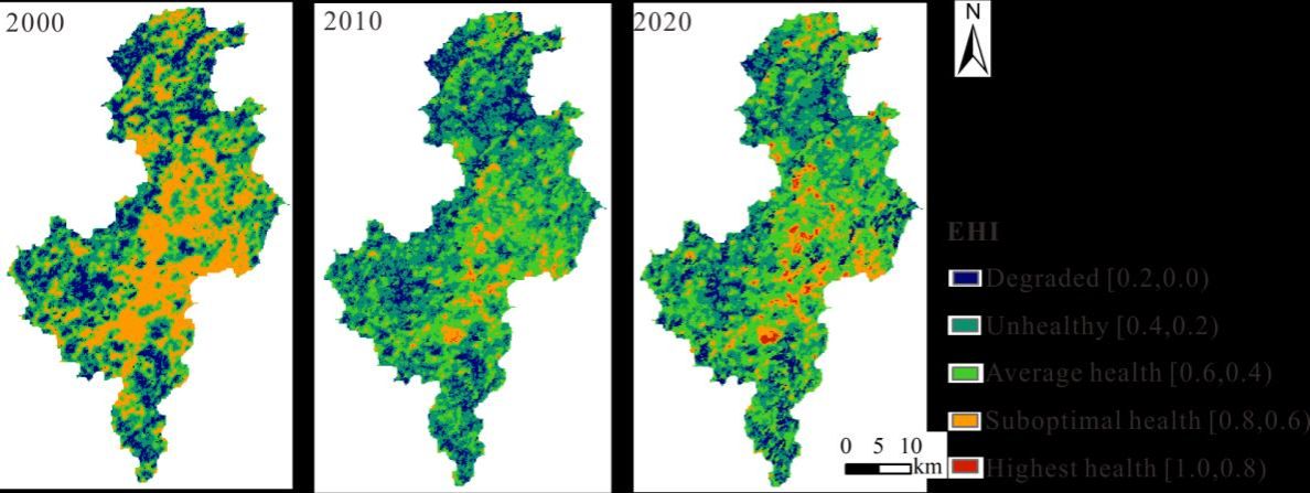 Year | Degraded (%) | Unhealthy (%) | Average health (%) | Suboptimal health (%) | Highest health (%) | EHI |