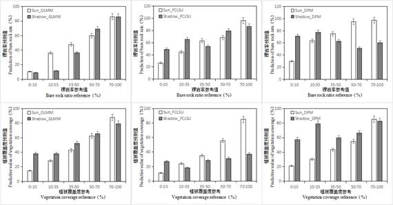 图 4光照区和阴影区域裸岩与植被覆盖度的预测百分比