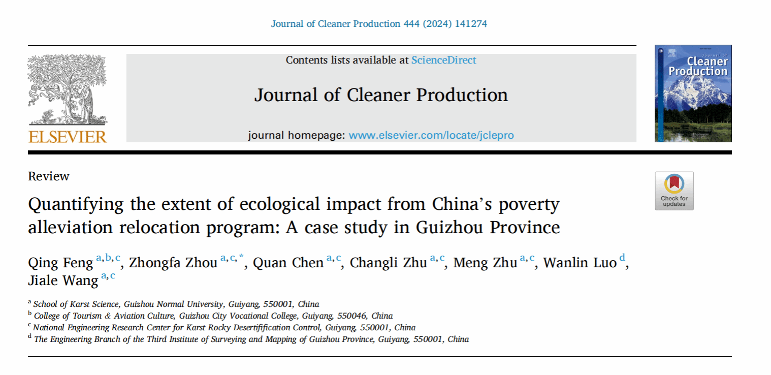 近日,必赢周忠发教授团队在生态环境学领域1区TOP期刊Journal of Cleaner Production(IF=11.1)在线发表题为“Quantifying the extent of ecological impact from China's poverty alleviation relocation program: A case study in Guizhou Province”的研究论文。