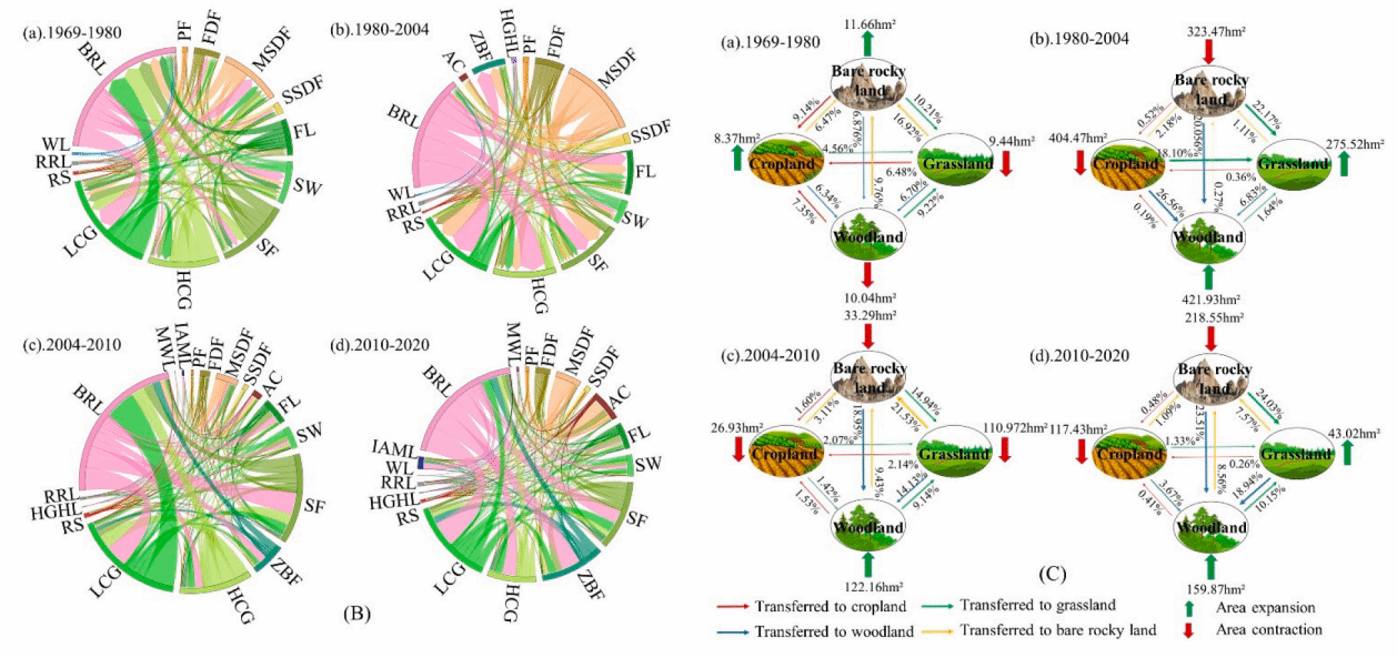 图5 B.花江峡谷土地利用转移,C.研究区裸岩地、耕地、林地和草地的转移方向