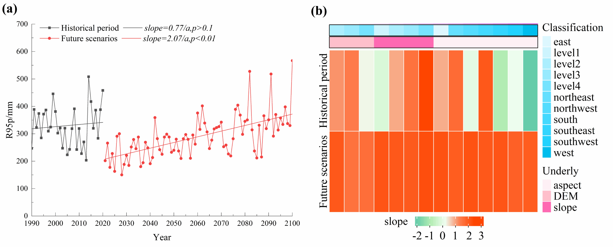 Fig. 5 Trends of R95p as a whole and under different subsurface conditions.