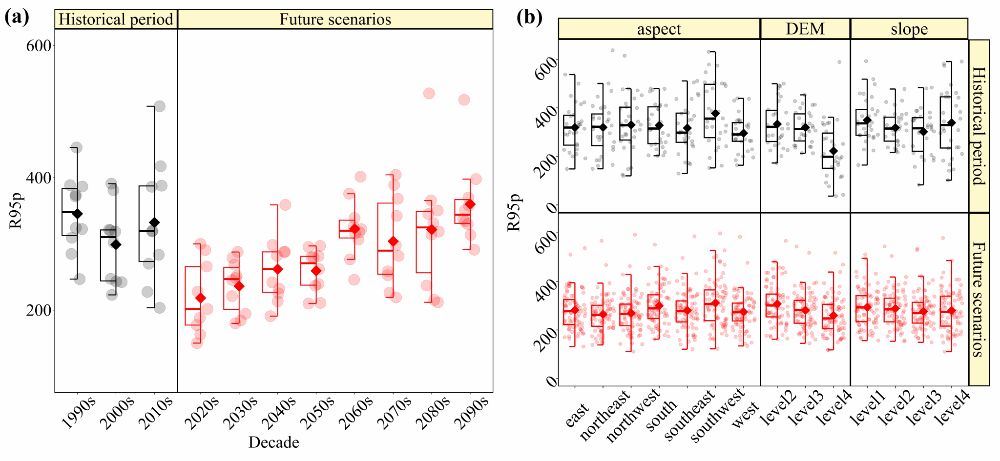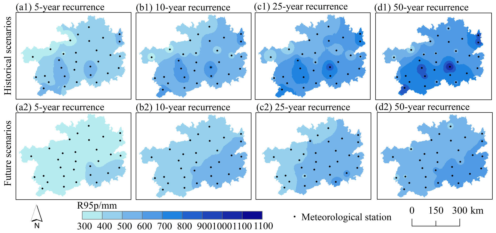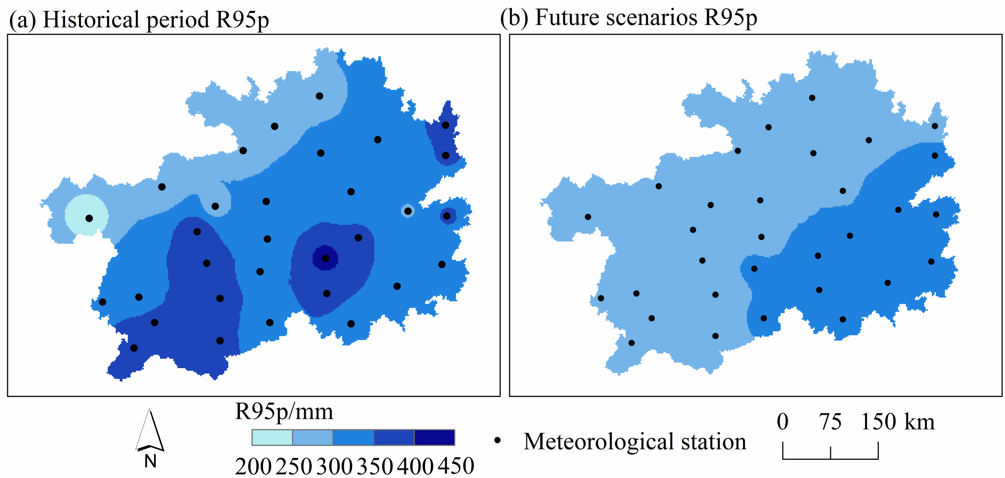 Fig. 6 Spatial distribution of R95p in historical and future periods.