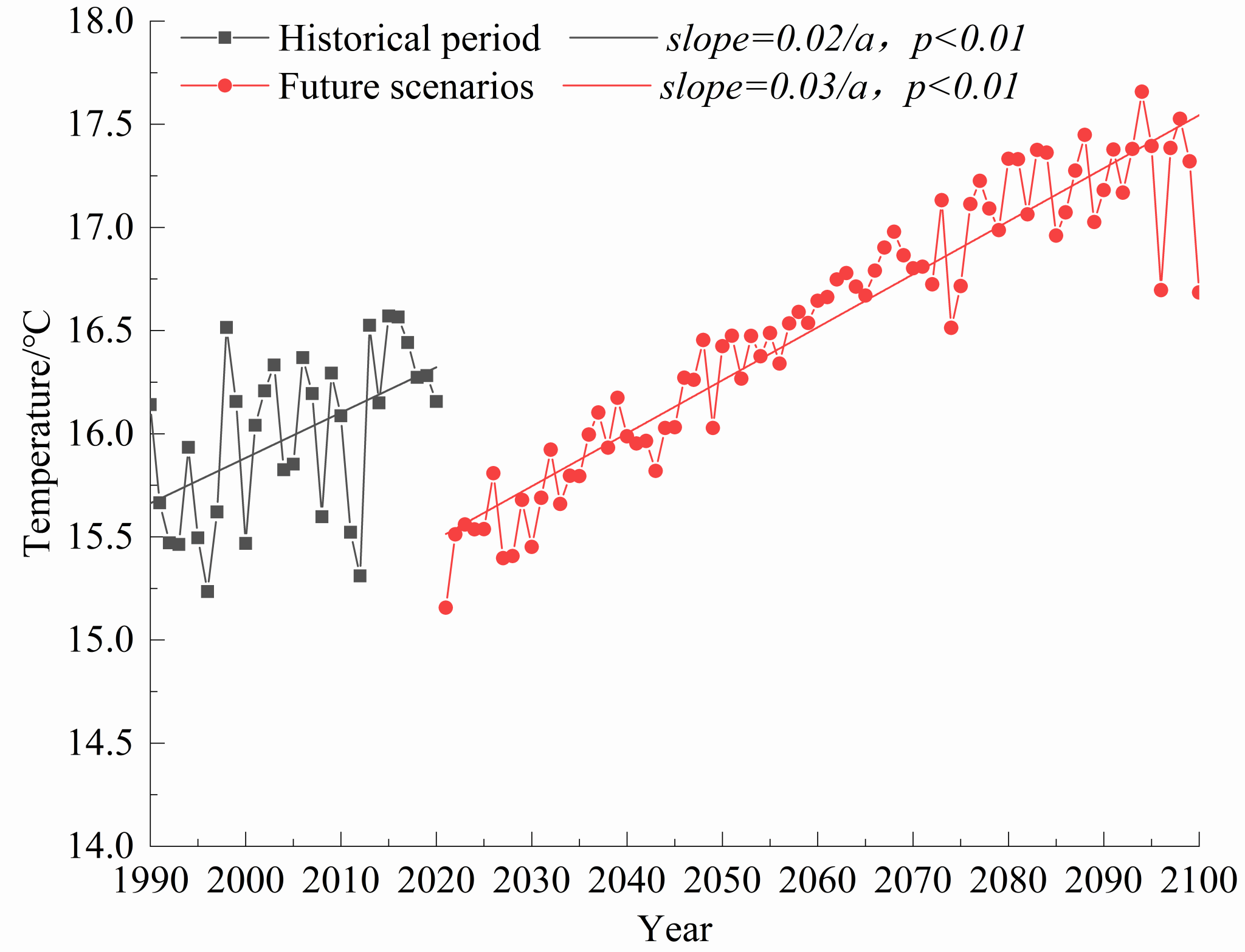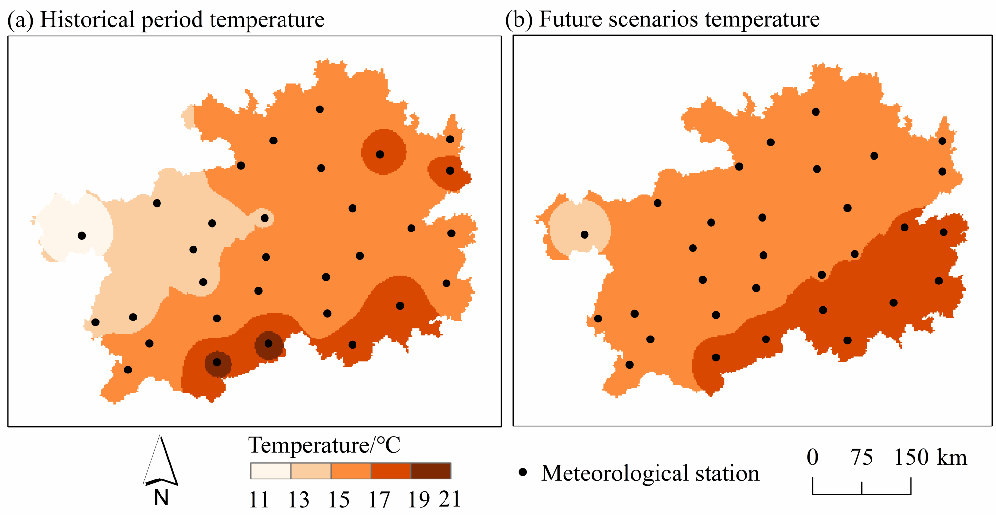 Fig. 10 Spatial distribution of temperature in historical and future periods.